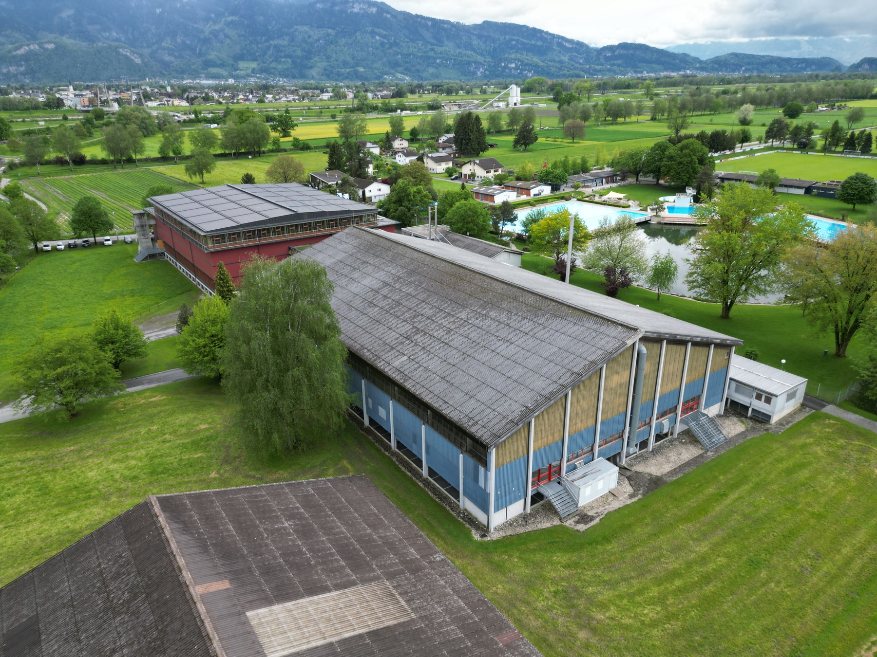 Ziel war neben dem Ersatzneubau der Kunsteisbahn auch Synergien zu den anderen Nutzungen (Freibad und Sporthalle) zu schaffen, insbesondere den Eingangsbereich und die Gastronomie zentral zu organisieren.