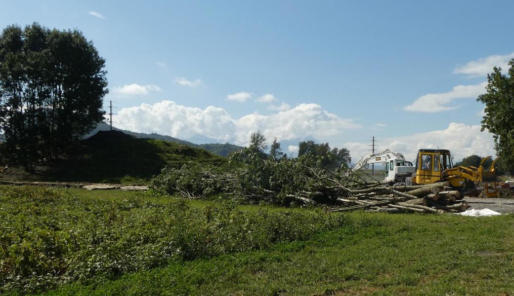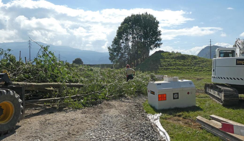 Die Bäume, die der Planierung des Kugelfanges im Weg stehen, verarbeiten die Forstarbeiten zu Holzschnitzeln. Das Roden des Hügels und dessen Abbau gehen Hand in Hand.