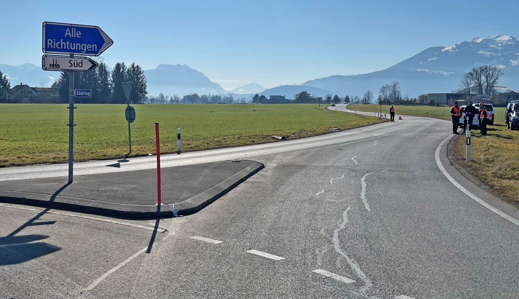 Der Unfall muss sich laut einer Medienmitteilung der Kantonspolizei zwischen 11.15 und 12.05 Uhr ereignet haben. Wohl wegen überhöhter Geschwindigkeit verlor die Lenkerin oder der Lenker die Kontrolle über das Auto, geriet auf die Verkehrsinsel und prallte in den Inselpfosten. Danach fuhr das Auto auf der linken Seite der Fahrbahn ins Wiesland, wo es mit einem Randleitpfosten und einem Betonschacht kollidierte. Der Schaden an der Unfallstelle wird mit rund 3000 Franken beziffert.