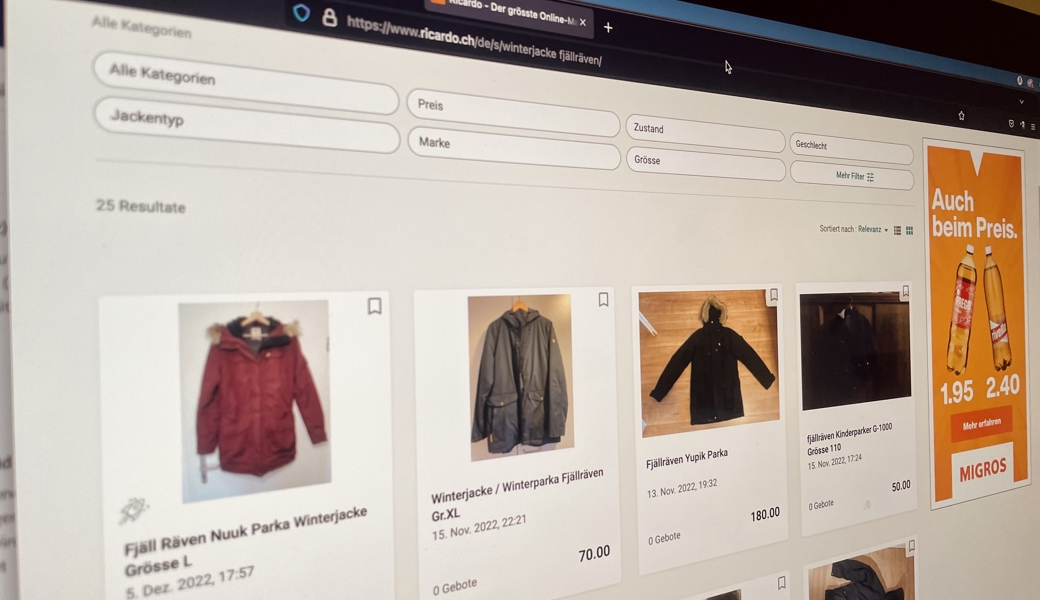Die Ricardo-Meldungen strömen rein. Ich kaufe gerne gebraucht, da steht auch immer gleich wieviel CO2 ich netterweise spare (Note 6 und Glitzersmiley im Fach Planetenretten), von meinem Portemonnaie gar nicht zu reden. Seit Wochen bookmarke ich also alle Winterjacken in der gewünschten Marke.