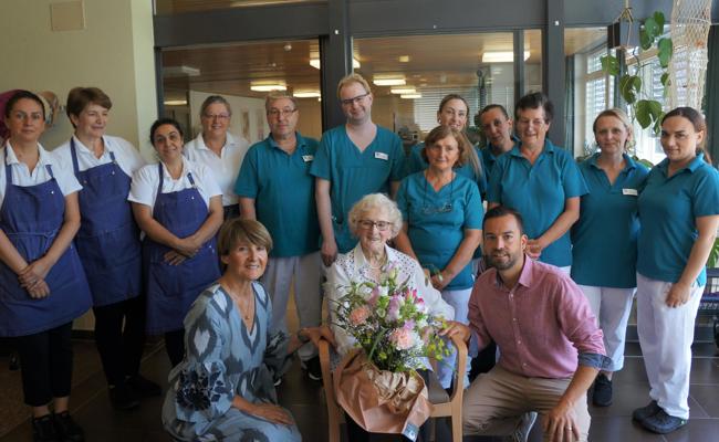 Am Sonntag, 19. Juni, durfte Elfriede Kehl bei schönstem Sommerwetter ihren 100. Geburtstag feiern. Zusammen mit ihren Kindern mit Familien und Freunden genoss sie ein feines Mittagessen in der festlich geschmückten Cafeteria.Die Gemeindepräsidentin von Balgach, Silvia Troxler, liess es sich nicht nehmen, der Jubilarin persönlich zu gratulieren und die besten Wünsche der Gemeinde zu überbringen. Das anwesende Personal des Verahus' wie auch der Zentrumsleiter Manuel Allemann gehörten ebenfalls zu den Gratulanten und stimmten ein Geburtstagsständchen an.Elfriede Kehl lebt erst seit Juli 2021, also noch nicht einmal ein Jahr, im Seniorenzentrum Verahus. Bis zu ihrem Umzug im Alter von 99 Jahren hat sie noch immer alleine gelebt, zuletzt im betreuten Wohnen in Lüchingen. Nebst dem Besuch ihrer Kinder erfreut sie sich besonders an ihren täglichen Spaziergängen im Verahus-Garten oder am Kontakt mit anderen Bewohnerinnen und Bewohnern.Das ganze Verahus freut sich mit Elfriede Kehl und wünscht ihr weiterhin gute Gesundheit und alles Gute.