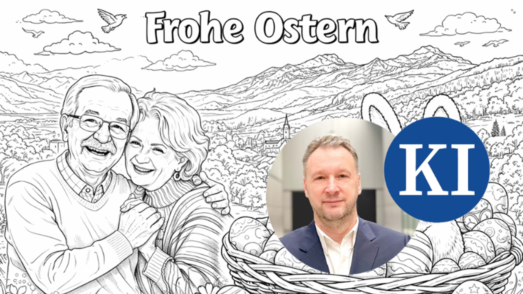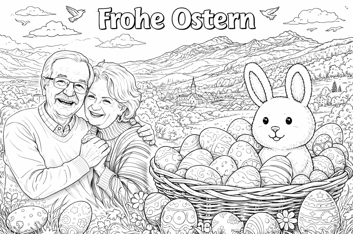 Die KI zeichnet nur die Vorlage. Die eigentliche Überraschung entsteht, wenn das Ausmal-Bild aus dem Osternest gezogen wird – und jemand erkennt: Das sind ja wir.