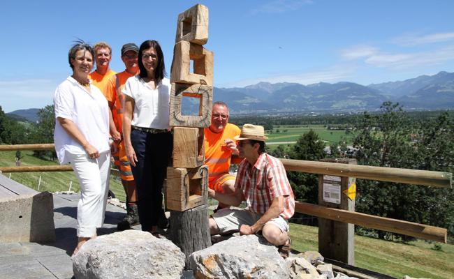 «Das Projekt Wegmarke war von Anfang an auf fünf Jahre ausgelegt und wird 2022 abgeschlossen», sagte Sabina Saggioro, Geschäftsleiterin des Vereins St. Galler Rheintal. Deswegen dürfte diese Wegmarke an der Färschstrasse wohl die letzte ihrer Art sein, da zurzeit keine weiteren geplant seien, obwohl das in diesem Jahr noch möglich wäre.Zehn Wegmarken weisen auf Besonderheiten hinInsgesamt stehen nun an zehn Standorten in Rheintaler Gemeinden solche Holztürme mit Aussichtsfenstern. Sie weisen auf Landschaftsperlen hin, die sich durch besondere Vielfalt oder laufende Entwicklungsprozesse auszeichnen. Wer durch das erste Fenster ins Tal hinuntersieht, blickt auf den Rastplatz Forstegg. Er ist Teil des Dreiländerwegs, der sieben Städte und Gemeinden im Dreiländereck verbindet, die ihre Beziehung über die Landesgrenzen hinaus vertiefen (siehe www.bewegung-begegnung.net).Das zweite Holzfenster ist auf das Vogelparadies Birka in Mauren gerichtet, die Nummer drei auf das Europaschutzgebiet Bangs-Matschels / Illspitz. Das vierte Fenster umrahmt den Blattenberg, wo jeweils die Freilichtbühne Rüthi ihre Theaterspiele abhält. Und Nummer fünf erfasst das Siedlungsgebiet von Rüthi.Wer den QR-Code scannt, der in unmittelbarer Nähe aller Wegkreuze angebracht ist, wird dabei auf den Verein Agglomeration Rheintal hingewiesen. «Dank den Fenstern fokussiert der Betrachter seinen Blick auf Besonderheiten», sagt Ivo Herrsche, der die Wegkreuze erschaffen hat. Er selber habe durch diese Arbeit die Gegend ganz anders kennen gelernt und sei auf viele Besonderheiten aufmerksam geworden, die ihm vorher nicht bekannt gewesen seien. Stets arbeitete er mit verschiedenen Hölzern, die aus der Gegend stammten.In Rüthi wies Herrsche auf den bereits schwarz gefärbten Sockel hin, der immer noch mit Rheinsand versetzt sei: Der Eichenstamm wurde für das Projekt vom heimischen Gemeindedienst denn auch extra aus dem Rhein geborgen. «Der Platz hier an der Färschstrasse bot sich an, weil er dank der Hanglage ein schöner Aussichtspunkt ist, der aber nicht weit vom Dorf entfernt liegt und so von allen erreicht werden kann», sagte Gemeindepräsidentin Irene Schocher. Die Gemeinde nutzte die Installation der Wegmarke, um den Platz rund um die bereits vorhandene Sitzbank aufzuwerten und eine kleine Aussichtsplattform daraus zu machen. Zweittext:Start in Altstätten, Schluss in RüthiDie Wegmarken, die nun in zehn Dörfern stehen, sind Teil des Projekts «Das Grüne Band», des Vereins St. Galler Rheintal. Die Bevölkerung soll damit für die Förderung der landschaftlichen Vielfalt des Rheintals und die aktive Erhöhung der Biodiversität in der Siedlung und am Siedlungsrand sensibilisiert werden. Die Aussichtsfenster weisen auf Landschaftsperlen hin. Der Balgacher Ivo Herrsche gewann den 2017 ausgeschriebenen Wettbewerb und erstellte am 22. Dezember des gleichen Jahres die erste Wegmarke auf dem Altstätter Forst. Inzwischen hat er neun weitere gebaut und auch schon einige repariert. Es bleibt bei zehn, wird nicht noch kurzfristig ein weiterer Antrag gestellt.