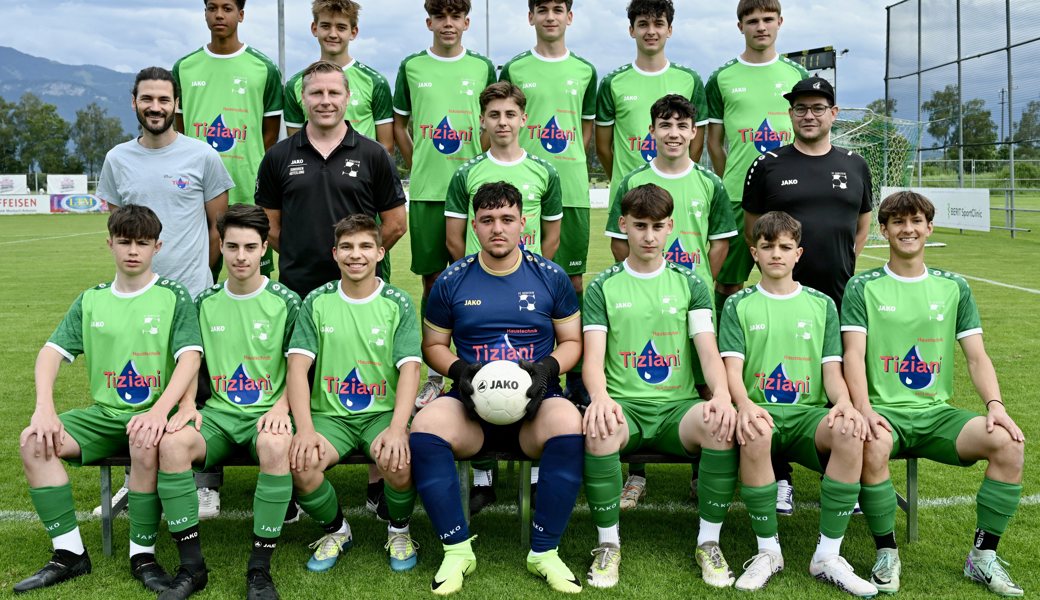 Die Spieler, das Trainerduo und der ganze Verein bedanken sich bei der Tiziani Haustechnik GmbH (vertreten durch Geschäftsführer Damian Tiziani, mittlere Reihe, ganz rechts) für ihr Engagement und hoffen, mit dem neuen Trikot möglichst viele Punkte zu gewinnen.