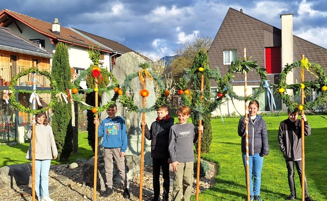 Traditionsgemäss durften die Schülerinnen und Schüler der 6. Klasse die Palmen für den Gottesdienst herstellen. Mit Unterstützung ihrer Mütter, Väter oder der Gotta, wurden die Palmen am Samstagmorgen mit viel Einsatz und Fantasie im Pfarreizentrum geschmückt. Am Beginn des Familiengottesdienstes durften die Schülerinnen und Schüler in einem feierlichen Einzug die Palmen in die Kirche tragen und im Chorraum platzieren.