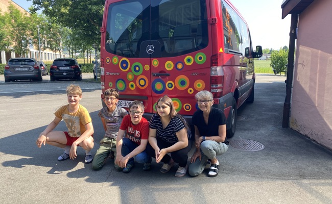 Das farbenfrohe Resultat lässt sich sehen. Die vielen Farben stehen für die Vielfalt der Schülerschaft. Und die Kinder steigen stolz in den von ihnen selbstgestalteten Schulbus.