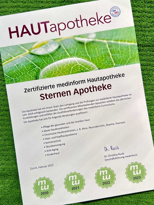 Als wiederholt zertifizierte Hautapotheke ist es für die Sternen Apotheke ein Anliegen, Betroffene in der Behandlung und Beseitigung der unreinen Haut zu unterstützen. Mit einer fachkundigen Beratung findet man gemeinsam die richtige Therapie und Hautpflege, die wirkt. Aktuelle Probleme mit Pickeln und anderen Unreinheiten können so langfristig und nachhaltig behandelt werden. Mit geeigneter Therapie und wertvollen Tipps gewinnt man die Kontrolle über die Haut zurück.