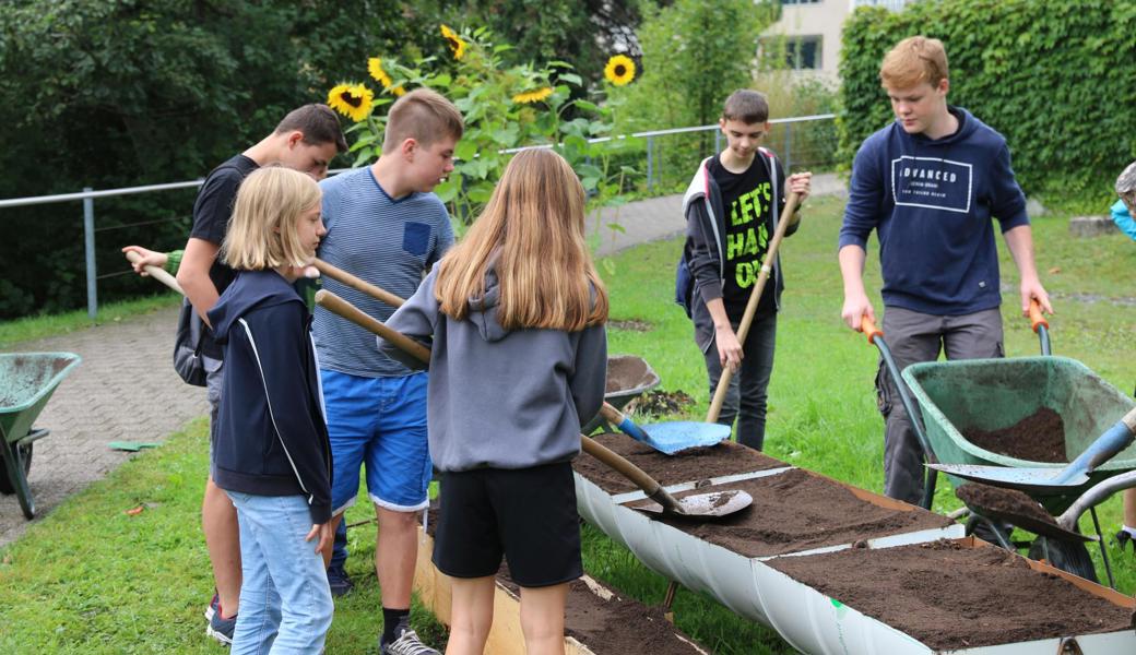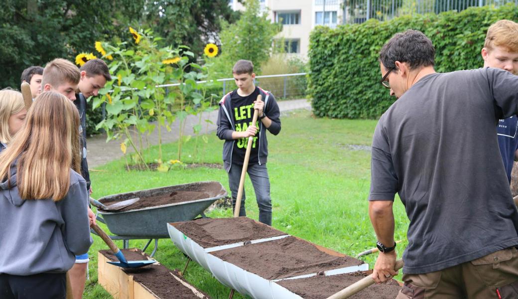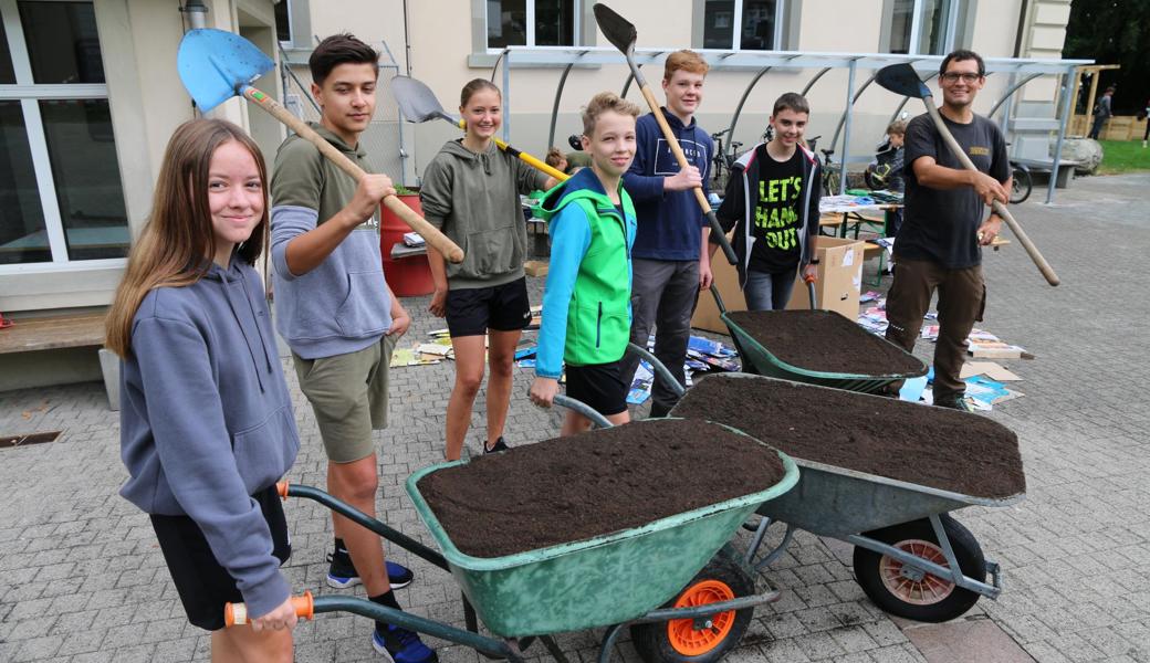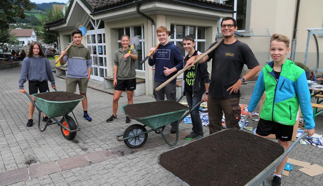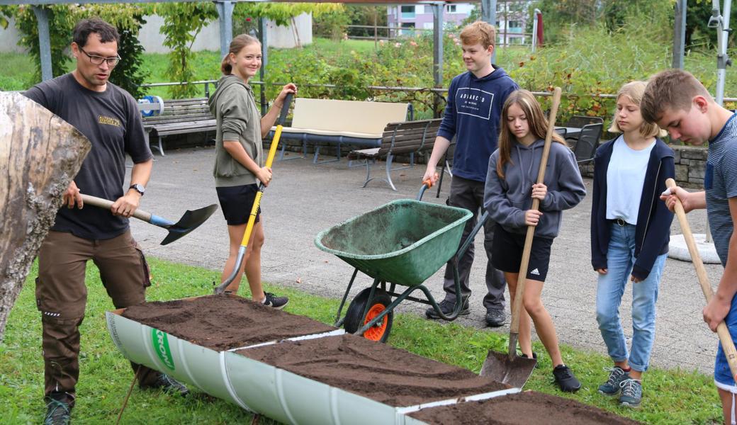 Hildegard BickelZehn Schüler der zweiten Sekundarstufe greifen am Donnerstagmorgen tatkräftig zu Schaufeln und laden Humus in die Schubkarren. Körpereinsatz ist gefragt und die Hände dürfen dreckig werden. Sie transportieren das Material zu den zwei Pflanzstandorten in der Marktgasse und beim Altersheim Haus Viva, wo sie die bereitgestellten Beete mit der Erde füllen. Den Schülern gefällt es, im Freien zu arbeiten. «Das Projekt lockert den Unterricht auf», sagen sie. «Es ist mal etwas anderes als nur Schule.» Das Schulhaus Feld der Oberstufe Altstätten führt vor den Herbstferien drei Sondertage zum Thema Nachhaltigkeit durch. In diesem Rahmen hat sich eine Gruppe für das Urban-Farming-Projekt unter der Leitung von Alex Gächter entschieden. «Bedienen, ohne zu hamstern»Der Fachlehrer, der Sport und Informatik unterrichtet, befasste sich im Vorfeld mit der Lebensmittelproduktion im städtischen Umfeld und erachtet die Idee als gute Sache. «Es ist eine Bereicherung für den öffentlichen Raum», sagt Alex Gächter. «Die Nutzpflanzen stellen wir der Bevölkerung zur Verfügung.» Wer mag, darf im Frühling reife Erdbeeren pflücken oder einen Salat ernten. Ein einsprechendes Plakat soll auf die Selbstbedienung hinweisen. Nicht zu vergessen sei der Gemeinschaftsgedanke: «Bedienen, ohne zu hamstern. Damit die Nächsten auch etwas haben.» Die ersten Setzlinge und Samen sind bereits in den Beeten: Nüssli- und Kopfsalat, Spinat und Kräuter. Die Schüler erwarten in einigen Wochen den ersten Ertrag. Jetzt, im Herbst, ist die Vegetation begrenzt. Ab November wächst nicht mehr viel. Doch das Projekt dauert bis Ende Mai und bietet Gelegenheit, auch im Frühling vitaminreiche Gewächse anzupflanzen. Die Schüler bewirtschaften je vier Pflanzgefässe pro Standort mit allem, was dazugehört – wie Jäten, Giessen und frisch Bepflanzen. Vom Futterfass zum SalatbeetDie Beete stellten sie aus upgecycelten Materialien im Werkunterricht von Urs Felber her. Verwendet wurden Holzpaletten, Alteisen und alte Futterfässer. Auch dies entspricht dem Nachhaltigkeitsgedanken der Sondertage. Alex Gächter erstellte ein Konzept und erhielt von der Stadtverwaltung die Bewilligung, den Standort beim Schwertbrunnen in der Marktgasse zu nutzen. Das Projekt ist gern gesehen. Doch im Städtli könnte Vandalismus Probleme bereiten. «Die Stadt hat uns darauf hingewiesen», sagt Alex Gächter. «Wir probieren es trotzdem.» Sollte es zu unliebsamen Vorfällen kommen, müssten die Schüler die Pflanzgefässe an einem anderen Ort platzieren. Beim Standort Haus Viva hat der Lehrer keine Bedenken. Die Bewohner freuen sich über die jungen Gärtner und darauf, bald ernten zu können. Das Urban-Farming-Projekt dauert bis Ende Mai. Es ist Teil der Imta, der internationalen musischen Tagung in Altstätten, die am 19. Mai stattfindet. Es besteht die Möglichkeit, das Projekt zu verlängern. Falls es Anklang findet und die Schüler die Freude an ihrem grünen Daumen weiter ausleben möchten. HinweisMehr Bilder auf rheintaler.ch