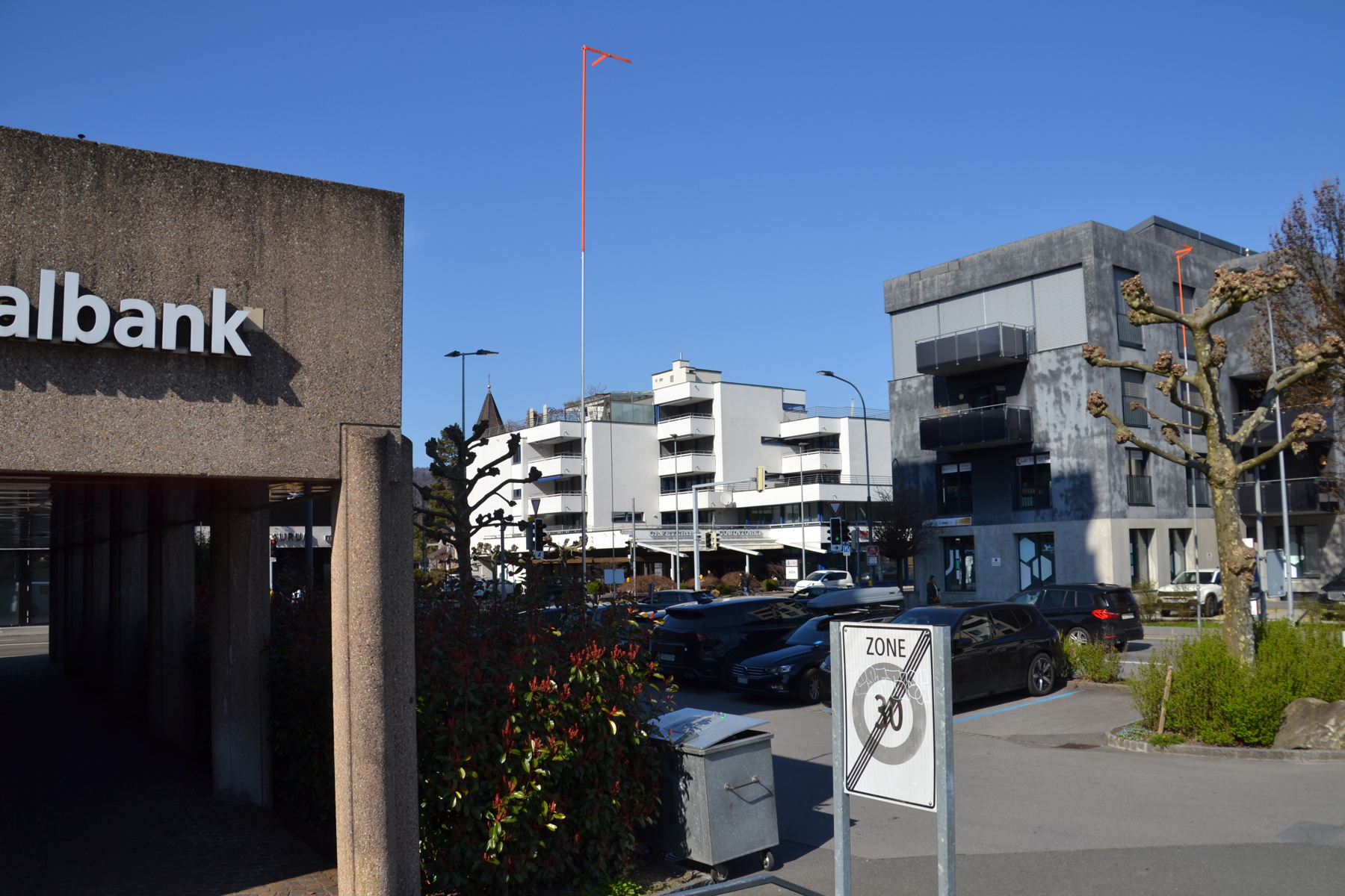 Wo heute ein Vorplatz mit acht Parkplätzen für Autos ist, soll Anfang 2027 ein Provisorium entstehen, wie die St. Galler Kantonalbank auf Anfrage sagt. Denn die Bank baut ihre Niederlassung an der Auerstrasse in Heerbrugg umfassend um. Im Provisorium werden die Kundinnen und Kunden in der ungefähr anderthalbjährigen Bauzeit bedient.