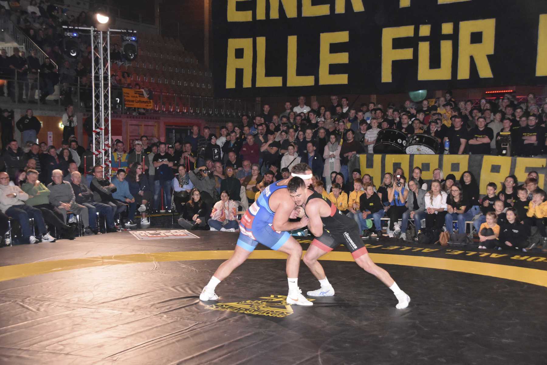 AnmeldenDie Musik wird lauter, neben der Matte schiessen Feuerstrahlen hoch. Der Einmarsch der Gladiatoren bringt das Publikum in Wallung. Die rot-blauen Gäste jubeln erst ihren Lieblingen zu, dann macht die gelb-schwarze Kriessner Wand Stimmung mit dem Einsatz aller Mittel.