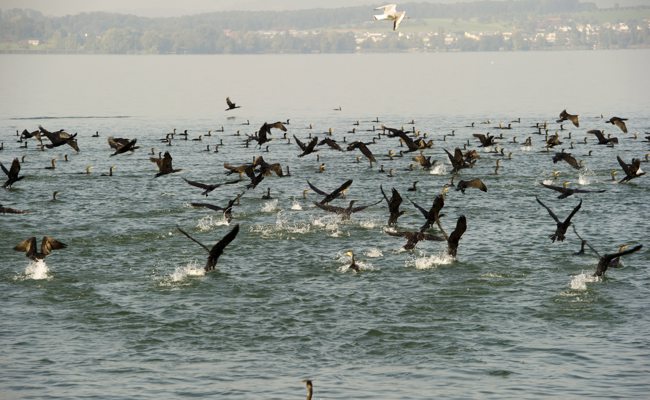 AnmeldenDie schwarzen Vögel drehen wenige Zentimeter über der Wasseroberfläche ihre Kreise. Es sind wohl mehrere hundert Kormorane, die momentan vom Seeufer aus, etwa in Goldach oder Horn, zu beobachten sind. Ein Vogelkenner ordnet das Phänomen ein..