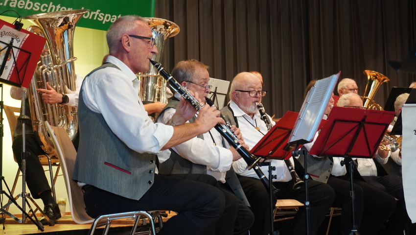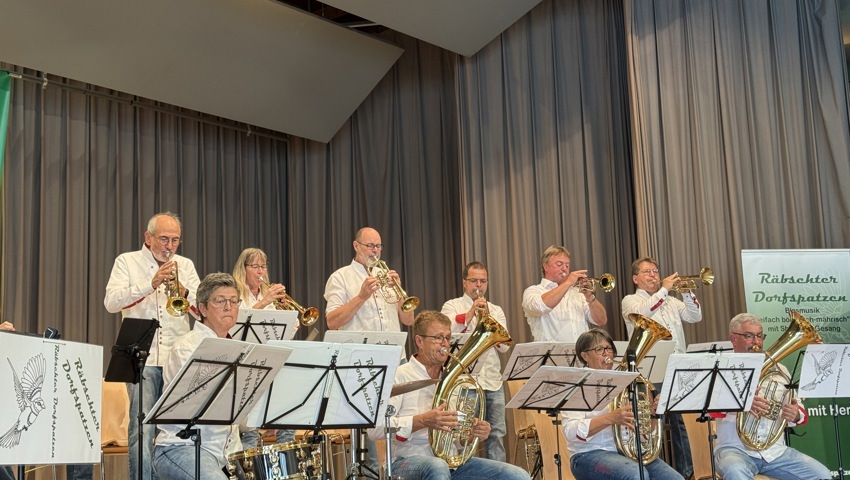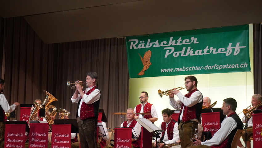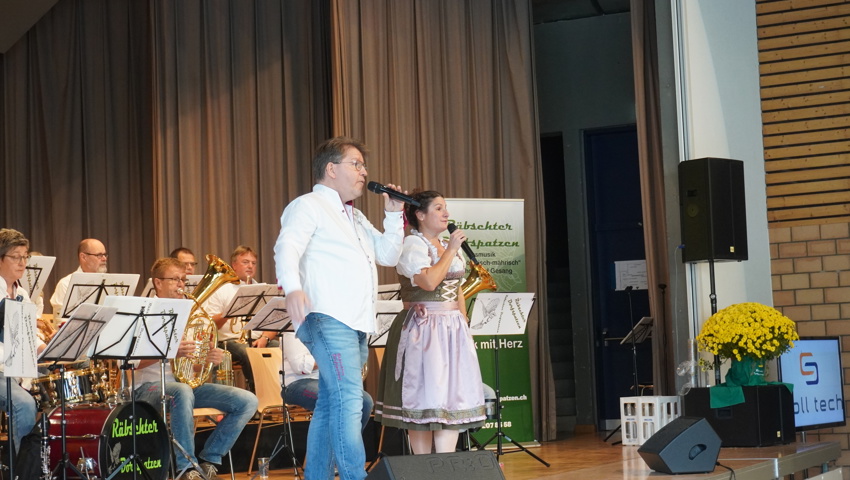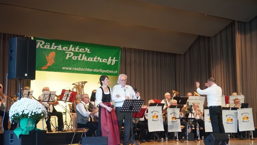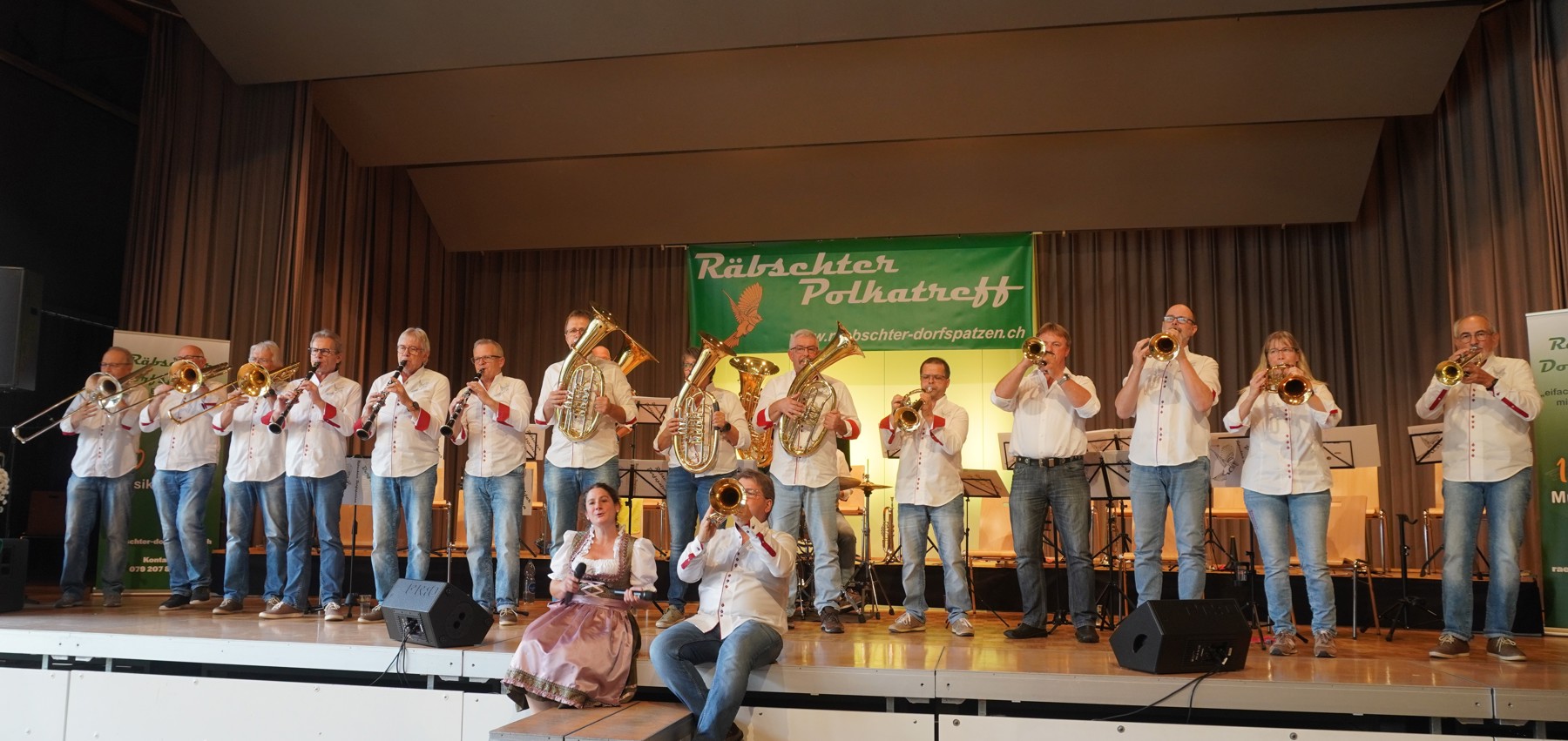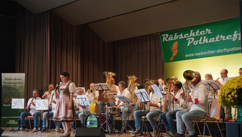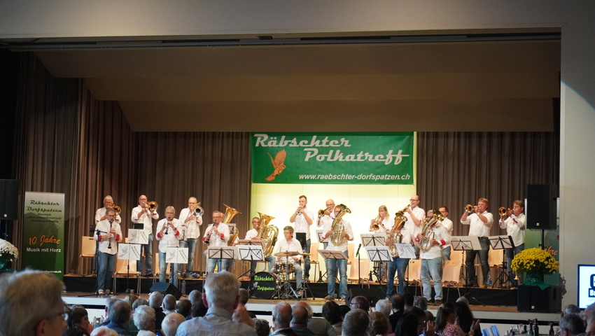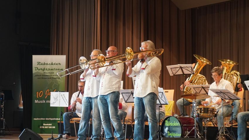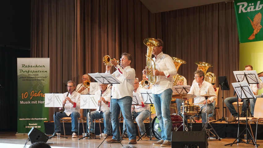 Nach einer kurzen Umbaupause gehörte die Bühne den Gastgebern: Die Räbschter Dorfspatzen präsentierten während ihres temporeichen Auftrittes ein vielfältiges Programm. Neben klassischer böhmischer und mährischer Blasmusik überzeugten sie mit Gesangseinlagen und virtuosen Soli. Die Begeisterung im Publikum war so gross, dass die Forderung nach Zugaben nicht lange auf sich warten liess – ein Zeichen für die gelungene Auswahl und Interpretation der Stücke.