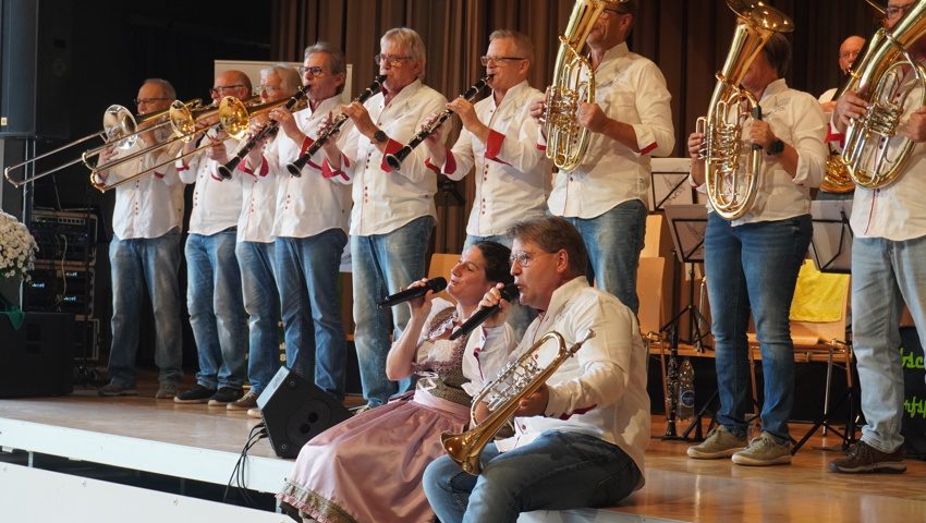 Den musikalischen Auftakt gestalteten die Schlossbühl Musikanten aus Wilhelmskirch nahe Ravensburg. Mit ihren kultivierten und gefühlvollen Darbietungen böhmischer und mährischer Blasmusik, bereichert mit eindrucksvollen Soloeinlagen, verstanden sie es, das Publikum von der ersten Minute an zu begeistern. Besonders hervorgehoben wurden die Stücke «Arrival», meisterhaft vorgetragen auf der Piccolotrompete, und «Swiss Lady», bei dem derselbe Musiker nicht nur das Alphorn spielte, sondern auch den Gesang übernahm. Der begeisterte Applaus liess nicht lange auf sich warten.