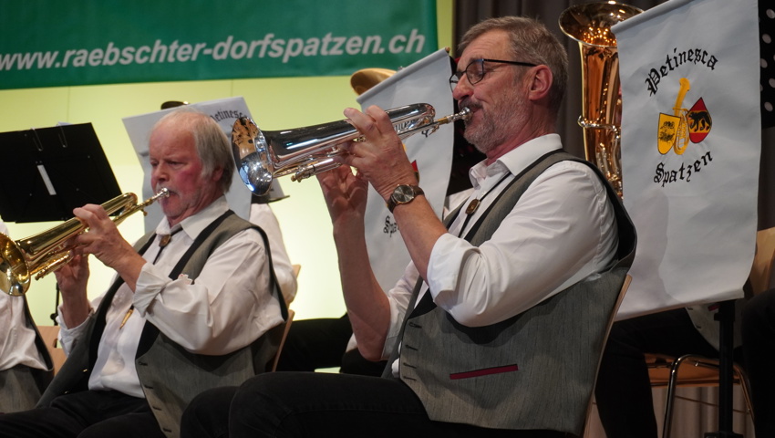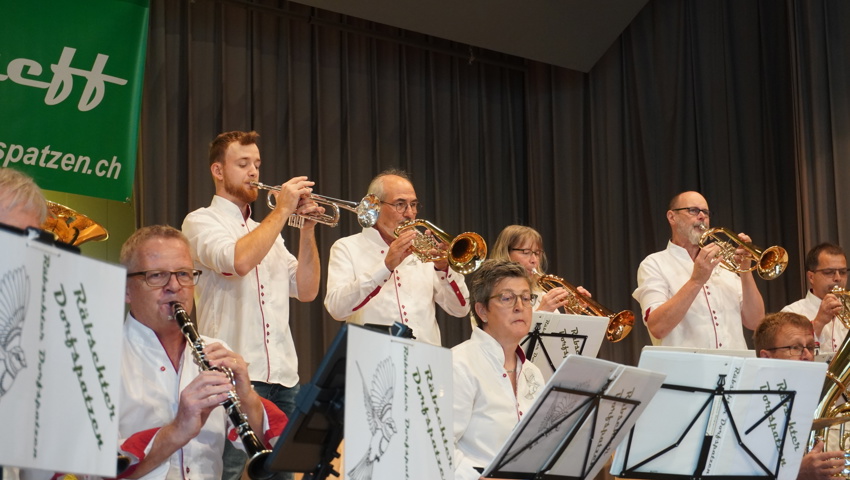 Den musikalischen Ausklang gestalteten die Petinesca Spatzen aus Worben im Berner Seeland. Mit viel Charme und Spielfreude verstanden es die Berner Musiker, die Begeisterung für die Blasmusik weit über die Bühne hinauszutragen. Auch sie wurden für ihr abwechslungsreiches Programm, das unter anderem durch ein Gesangsduo bereichert wurde, mit Zugabenwünschen belohnt.