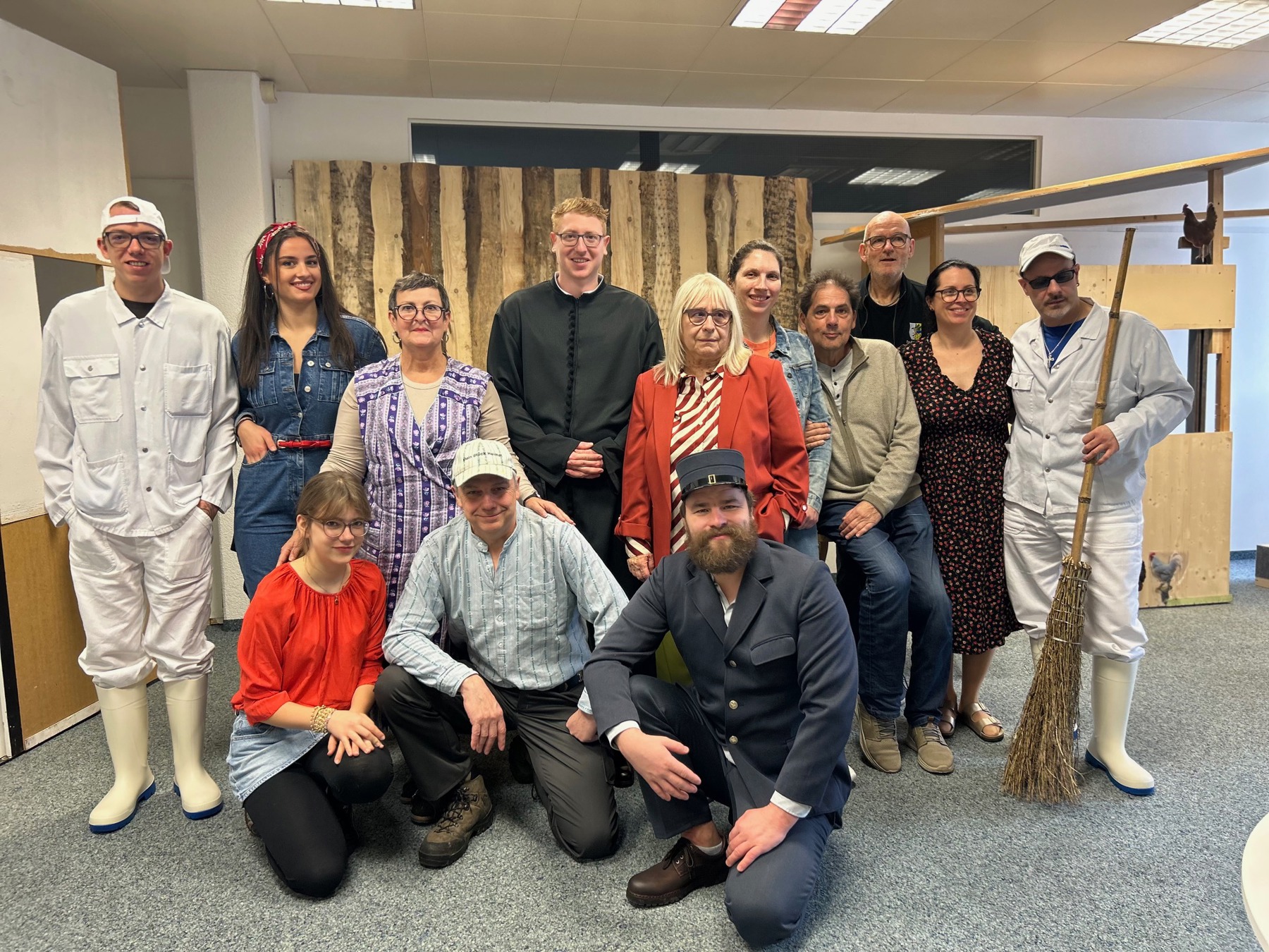 Die Inszenierung steht ganz im Zeichen des Generationenaustauschs. Erfahrene Schauspielerinnen und Schauspieler teilen sich die Bühne mit jungen Talenten, die teilweise erstmals Theaterluft schnuppern. Mit Kaira Sieber, Albanë Ebibi und Patrick Biser stehen gleich drei Nachwuchsdarstellende zum ersten Mal in einer Rolle auf der Bühne. Marco Frischknecht, Joanne Blatter und Philipp Jossi haben sich bereits in früheren Produktionen bewährt und gehören inzwischen zum festen Ensemble. Unterstützt werden sie von den Routiniers Gianni Ceraolo, Roger Frischknecht, Susan Gerhäuser, Nadja Mauro, Susi Miara sowie Peter Stäuble, der sich in seiner Rolle als Moderator nur allzu gern ins turbulente Bühnengeschehen einmischt.
