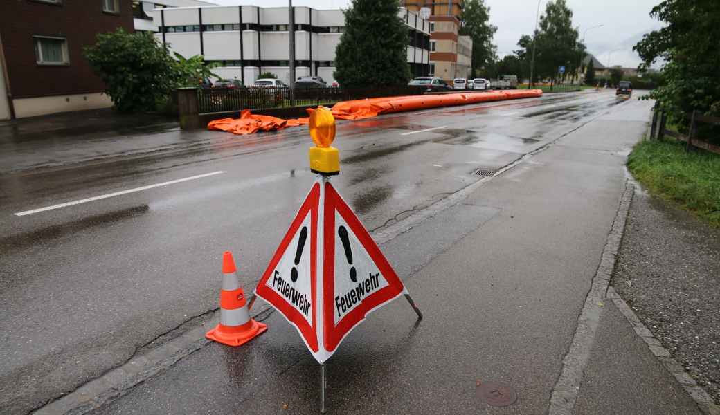In Berneck zum Beispiel wurde die Einfahr zur Gemperenstrasse gesperrt, auf der Tramstrasse wurden sogenannte Beaver ausgelegt. Die künstlichen orangen Dämmer sollen das Wasser zurückhalten, wenn der immer noch sehr hoch stehende Littenbach doch noch über die Ufer treten sollte.