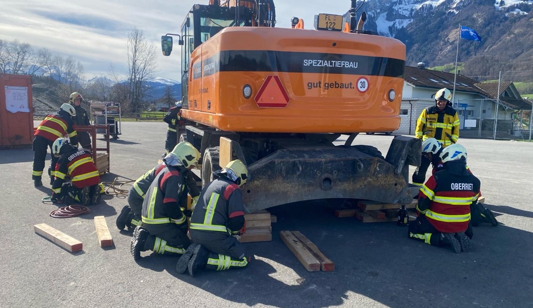 Bei frühlingshaftem Wetter bildeten sich 41 Offiziere und 48 Unteroffizier in je Lektionen weiter. Für die Unteroffiziere galt es, die speziellen Gerätschaften der Feuerwehren im Verbandsgebiet kennenzulernen. Dazu gehören leistungsstarke Lüfter der Feuerwehr Oberriet, der Sprungretter und die Drohne der Feuerwehr Altstätten-Eichberg sowie der Löschnagel, der auf der regionalen Hubrettungsbühne stationiert ist. Dieser wird z.B. bei Bränden im Dach verwendet, das heisst der Löschnagel wird durch die Ziegel hindurch geschlagen und über die Düsen an der Spitze kann gezielt Wasser eingebracht werden. Weiter beschäftigten sich die Unteroffiziere mit der Befehlsgebung, Teambildung und dem Bewegen von Lasten.