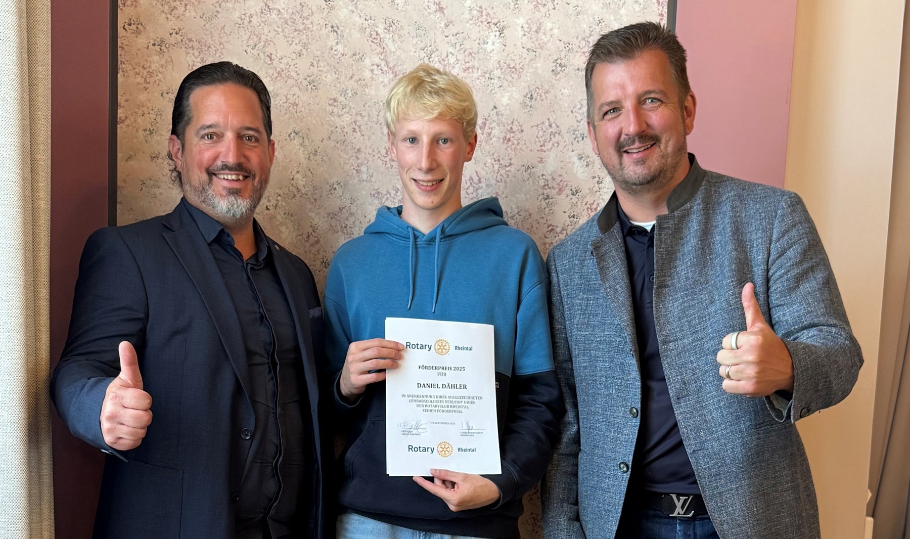 Die Übergabe des Preises an Daniel Dähler erfolgte im Rahmen eines Clubmeetings im Gasthaus Ochsen in Berneck. Überreicht wurde die Auszeichnung durch die Rotarier Sandro Hess und Ivo Eggenberger. Daniel Dähler hat seine Ausbildung zum Elektroniker EFZ mit Berufsmaturität bei der Ausbildungsorganisation libs in Heerbrugg absolviert und den praktischen Teil schwerpunktmässig bei der Partnerfirma Leica Geosystems durchlaufen. Seine Lehre schloss er mit der herausragenden Note 5.7 ab. Dieses Ergebnis belegt seine besondere fachliche Leistung eindrücklich.