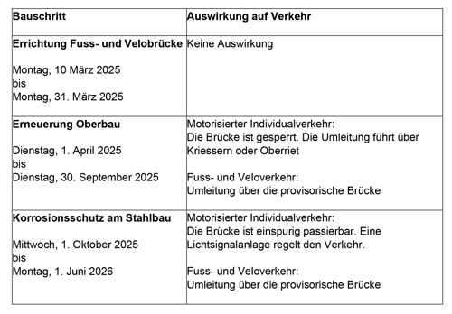 Die Arbeiten beginnen am Montag, 10. März. Zunächst wird eine provisorische Fuss- und Velobrücke errichtet, anschliessend erneuern der Kanton und das Land Vorarlberg den gesamten Oberbau der Brücke. Darauf folgt der Korrosionsschutz für den Stahlbau, schreibt das Bau- und Umweltdepartement in einer Mitteilung. Zwischen April und September ist die Brücke für den motorisierten Verkehr gesperrt.