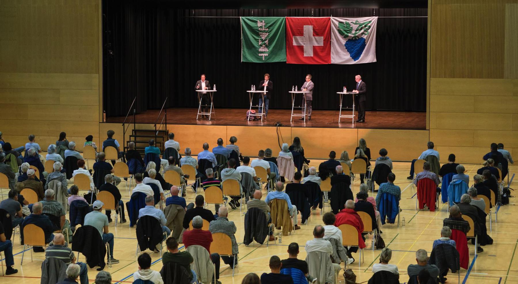 «Eigentlich müssten Sie sich das Präsidium teilen», sagte Moderator Stefan Schmid im Laufe des Abends und spricht damit den Umstand an, dass die drei Kandidaten für das Gemeindepräsidium in Thal kaum die Messer wetzen, sondern einander bei Themen wie Verkehr, qualitatives Wachstum, Airport und Steuerfuss schon beinahe harmonisch beipflichten. Mehr als einmal ist am Montagabend in der gut besetzten Bützelhalle in Staad zu hören: «Da kann ich mich meinem Vorredner nur anschliessen.»Emotional wird die vom Chefredaktor des «St. Galler Tagblatts» geleitete Podiumsdiskussion aber dann gelegentlich doch noch. Etwa, wenn sich Michael Fitzi (parteilos) und Simon Diezi (FDP) gegenseitig vorwerfen, bei ihrem Zusammentreffen vor einigen Wochen im Ochsentorkel gesagt zu haben, sie wollten gar nicht zur Wahl antreten. Wie viel Wein vom Buechberg damals bereits getrunken war, erfahren die Besucher am Podium nicht. Matthias Gehring (SVP), von der Findungskommission ins Rennen geschickt, verfolgt das kurze Gemetzel seiner Mitstreiter schmunzelnd und sieht sich in seiner Antwort auf die Frage bestätigt, wieso er die richtige Wahl für Thal sei: «Weil ich Erfahrung als Gemeindepräsident habe und als Auswärtiger ohne Vorbelastung hierher komme.» Die schwarzen Wolken über Thal vertreibenIn der Fragerunde am Schluss spricht ein Votant von einer Schlammschlacht, die beschämend sei für Thal. Zur Sprache kommen dabei der Wahlflyer des Komitees «Simon Diezi», der über Thal schwarze Wolken hängen sieht, und ein Facebook-Post von Fitzi, in dem dieser den gesamten Thaler Gemeinderat als inkompetent bezeichnet. Gelikt wurde der Post ausgerechnet von Diezi. Beide sagen, Post und Like seien aus einer Emotion heraus entstanden, und entschuldigen sich dafür. Im Publikum sind dennoch Zweifel auszumachen, ob eine gute Zusammenarbeit dieser beiden Kandidaten mit dem Gemeinderat überhaupt möglich wäre.Simon Diezi und Michael Fitzi sehen da keine Probleme. Wird er gewählt, dann will Fitzi die Gemeinde wieder zur Ruhe bringen. «Ich werde transparent und offen kommunizieren, gemeinsame Ziele definieren und den Teamspirit im Rat fördern. Wenn jemand zu seinem Wort steht, dann ich.» Diezi sagt dazu: «Ich würde mich bei der Bevölkerung für das Vertrauen bedanken und diese bei Projekten miteinbeziehen. Als Gemeindepräsident würde ich mit demselben Engagement ans Werk gehen, wie ich es bereits als Präsident der Ortsbürger tue. Mit dem Gemeinderat habe ich bereits jetzt sehr gut zusammengearbeitet.»Wieso er denn mit seiner Bewerbung so spät aus dem Busch gekommen sei, will der Moderator wissen. «Ich habe einige Zeit gebraucht, um die Situation richtig einzuschätzen und mich auch mit Familie, Arbeitgeber und Ortsbürgern besprochen. Ich bin spät dran, ja, aber nicht zu spät.» Wieso auf dem Flyer des Komitees keine Namen stünden, will ein Mann aus dem Publikum wissen. Es werde in diesen Tagen ein neuer Flyer mit den Namen von 200 Bürgern verteilt, die seine Kandidatur unterstützen würden, sagt Diezi und macht klar: «Felix Bischofberger hat mit dem Komitee überhaupt nichts zu tun. Was diesbezüglich im Dorf behauptet wird, ist falsch.»Auf dem Christ-Areal ein neues Rathaus bauenIn der Folge wird wieder mehr über die Sache diskutiert. Ein Votant fragt: «Wieso bauen wir auf dem Christ-Areal nicht ein neues Rathaus, anstatt das alte teuer zu renovieren?» Ein Gedanke, dem alle drei Präsidiumsanwärter etwas abgewinnen könnten. Aber leider seien die Möglichkeiten eines Ausbaus des Rathauses mit Wohneinheiten durch die Vorschriften des Denkmalschutzes arg limitiert. So könnten keine Aussenräume wie Balkone geschaffen werden, weshalb eine Vermietung schwierig wäre.Leider sehe sie auf dem Podium keine Frau, was schade sei, sagt eine Sprecherin aus dem Publikum. Wie denn die drei Herren zu einer Frauenförderung stünden? «Ich finde das wichtig. Wir haben viele starke Frauen in wichtigen Funktionen in der Ortsgemeinde. Ich würde dies auch bei der politischen Gemeinde stark fördern», sagt Diezi. «Das Geschlecht darf keine Rolle spielen, die Qualifikation muss entscheidend sein», sagt Fitzi und betont, dass es auch den Schritt der Frauen brauche. Diese sollten sich mehr zutrauen und anspruchsvollere Position anstreben. Gehring findet es «super lässig», dass im Gemeinde- und Schulrat von Thal bereits mehrere Frauen tätig sind. «Die Türen für noch mehr Frauen sind offen, denn Frauen können diese Arbeit genauso gut erledigen wie Männer.»Ein unterirdischer Kreisel, um Staad zu entlastenBezüglich Steuerfuss sind sich die drei einig, den historisch tiefen Steuerfuss von 89 Prozent zu konsolidieren. «Die Verschuldung der Gemeinde hat zugenommen, das muss man im Auge behalten, ehe man über eine neuerliche Steuersenkung nachdenkt», so Fitzi. Die 89 Prozent seien eine gute Ausgangslage, sagt Diezi. Firmen hätten zwar trotz Corona besser abgeschlossen als erwartet, doch momentan sehe auch er keine Notwendigkeit für eine Steuersenkung. Gehring sagt: «Es ist grossartig, dass Thal den tiefen Steuersatz halten konnte. Doch Corona tut das Seine dazu, dass eine Steuersenkung momentan nicht angebracht ist.»Einig sind sich Gehring, Diezi und Fitzi darin, Staad vom Durchgangsverkehr zu befreien, wobei man sich ernsthaft über einen unterirdischen Kreisel beim Bahnübergang Gedanken machen müsse. Der Gemeindepräsident müsse diesbezüglich beim Kanton Druck ausüben. Dem Airport attestieren die Kandidaten eine wichtige wirtschaftliche Rolle für die ganze Region. Gehring betont, dass qualitatives Wachstum für Thal wichtig sei, die Infrastruktur aber mitwachsen müsse. Diezi und Fitzi stimmen dem zu und mahnen, dass die Entwicklung des Christ-Areals professionell angegangen werden müsse.