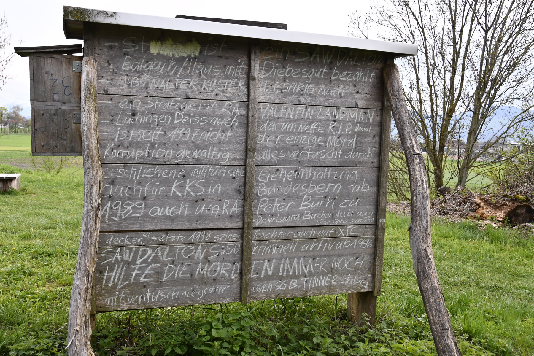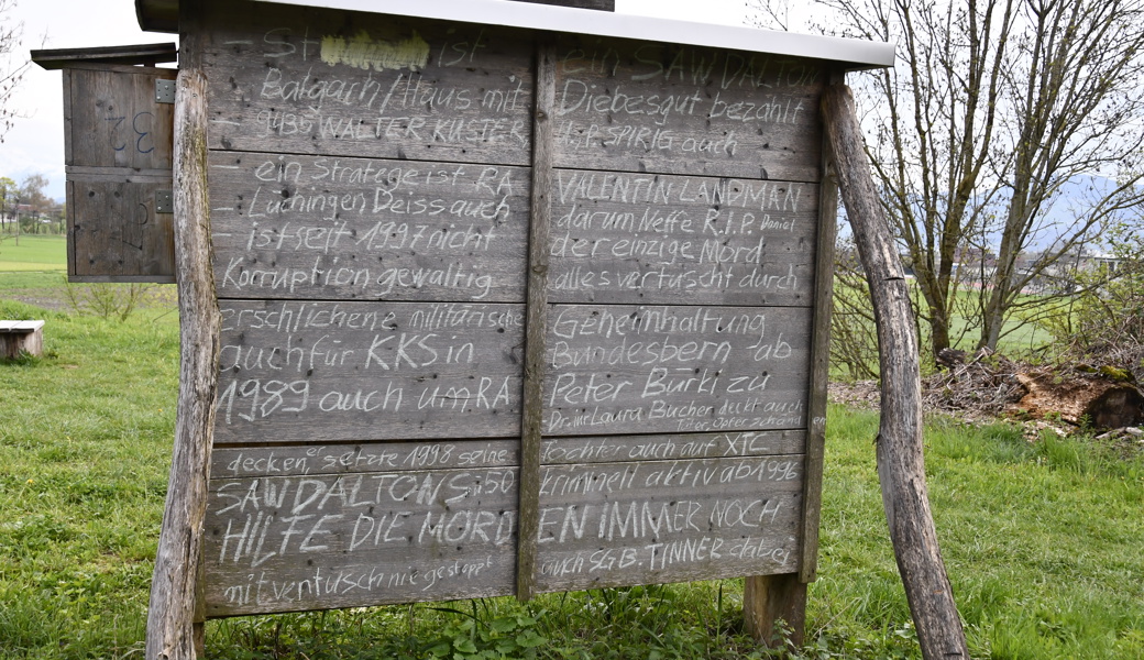 Es sind wilde Anschuldigungen, die der Mann beidseitig mit Kreide auf das Bienenhotel gekritzelt hat. Namentlich werden Personen des öffentlichen Lebens wie Bundesrätin Karin Keller-Sutter, die Regierungsräte Beat Tinner und Laura Bucher oder Rechtsanwalt Peter Bürki angeprangert. Wofür genau, bleibt ein Rätsel. Die Sätze ergeben kaum einen Sinn.