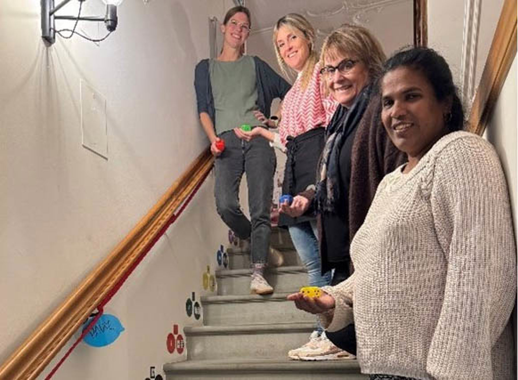 Damit auch die Kleinsten mitspielen können, sind die Stufen bunt mit Zahlen und Farben markiert, und gespielt wird mit den passenden Würfeln. «Wir möchten Bewegung im Alltag fördern und spielerisch dazu ermutigen, die Treppe statt den Lift zu nehmen», sagt Raphaela Walker Schmid, Initiantin des Leiterlispiels und Co-Leiterin des Zentrums. Weil das Haus sehr ringhörig ist, darf das grosse Spiel jeweils am Freitagvormittag ausprobiert werden; die Anleitung und Würfel gibt's im Reburg-Kafi.