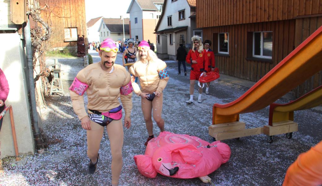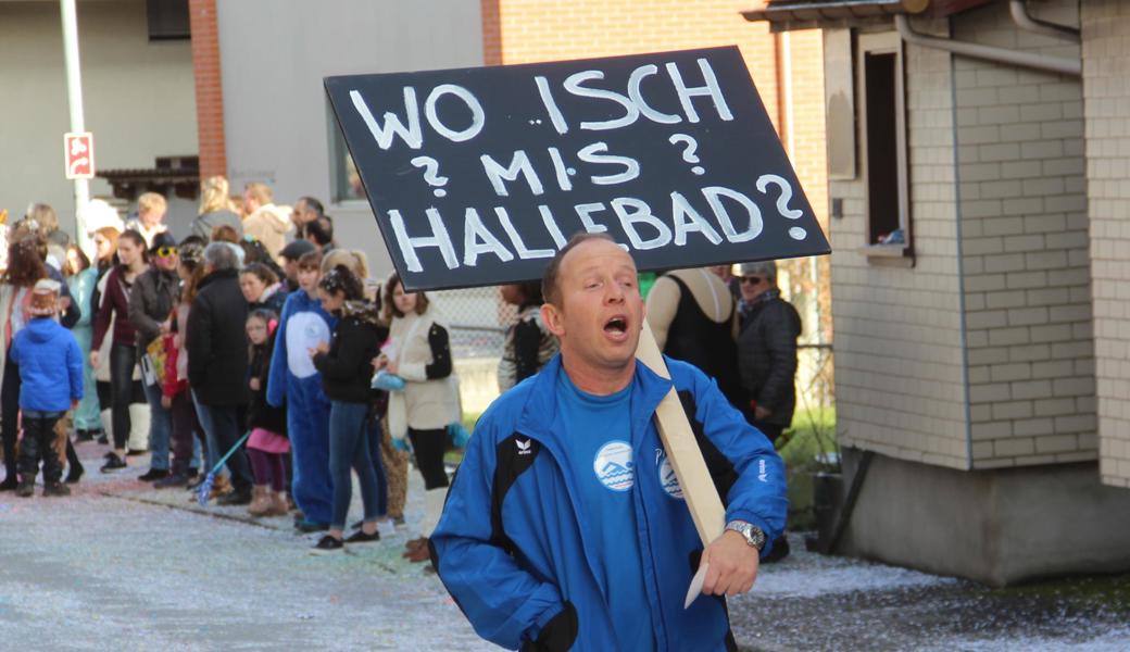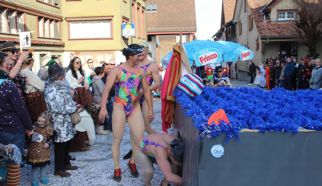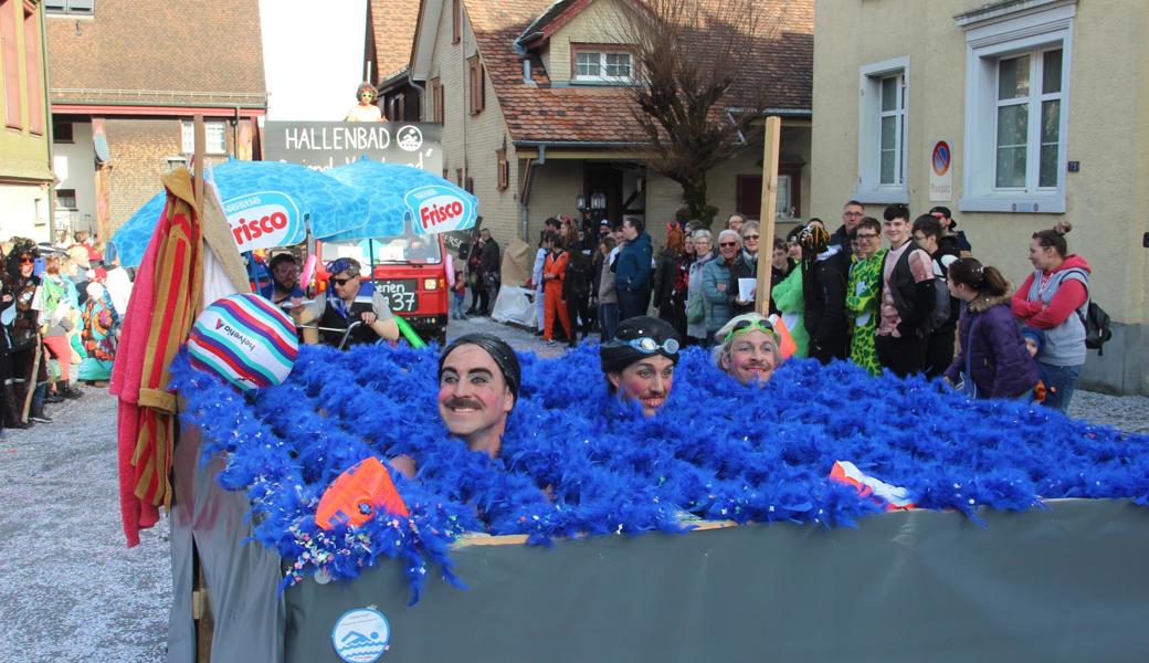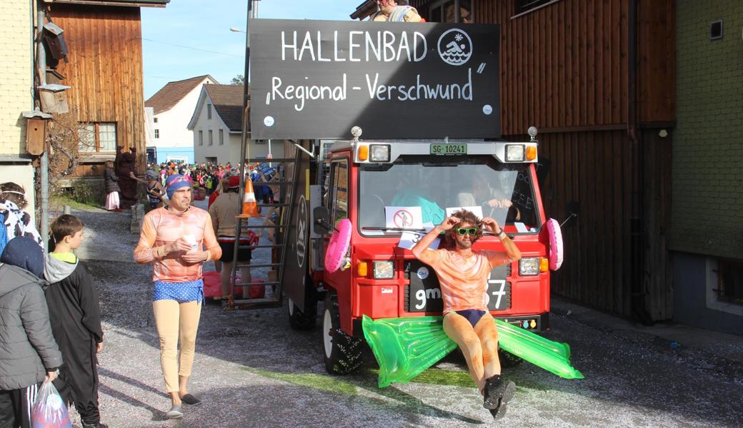 Einen Hallenbad-Verbund lässt sich der Badegast gern gefallen. Doch die Oberrheintaler und die Balgacher haben es nicht geschafft, ihre Hallenbäder aneinander vorbei zu erneuern. Tatsächlich brachten sie es fertig, dass beide Bäder vorübergehend geschlossen sind.Für die Ferien gmbh ein gefundenes Fressen. Sie stellen das Thema perfekt dar und ernteten viel Applaus am Rebsteiner Umzug.Die Umsetzung ist mehrteilig. Zunächst bekam das Publikum ein raffiniert gebautes Schwimmbecken zu sehen, aus dem drei Badegäste auftauchten und die eine gute Show boten. Es folgten ein Eiswagen, Badende, ein erstklassiger Kiosk mit Würsten vom Grill, sodann der grosse Wagen mit der Beschriftung "Hallenbad-Verschwund" - und zu guter Letzt folgte Adrian Heeb mit einer Tafel und der Frage: "Wo isch mis Hallebad?" Das Schwimmen ist das liebste Hobby des Rüthners, der als Mensch mit Beeinträchtigung im "Rhyboot" arbeitet und mit seiner offenen und freundlichen Art im ganzen Rheintal bekannt ist.Wäre für den Auftritt der Ferien gmbh eine Note zu vergeben, es wär eine Sechs plus!