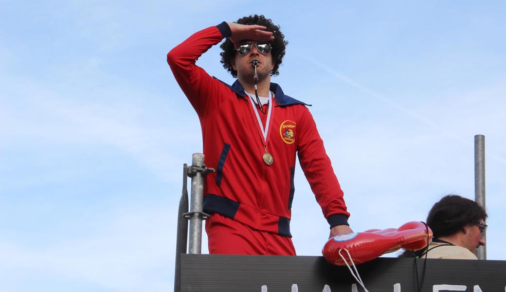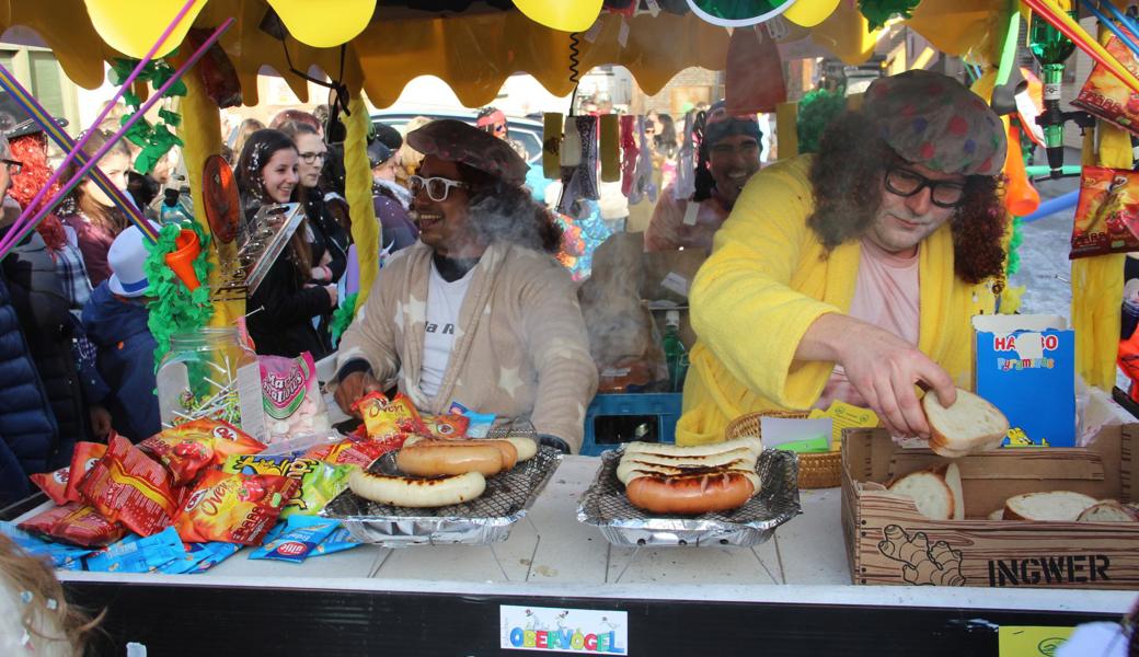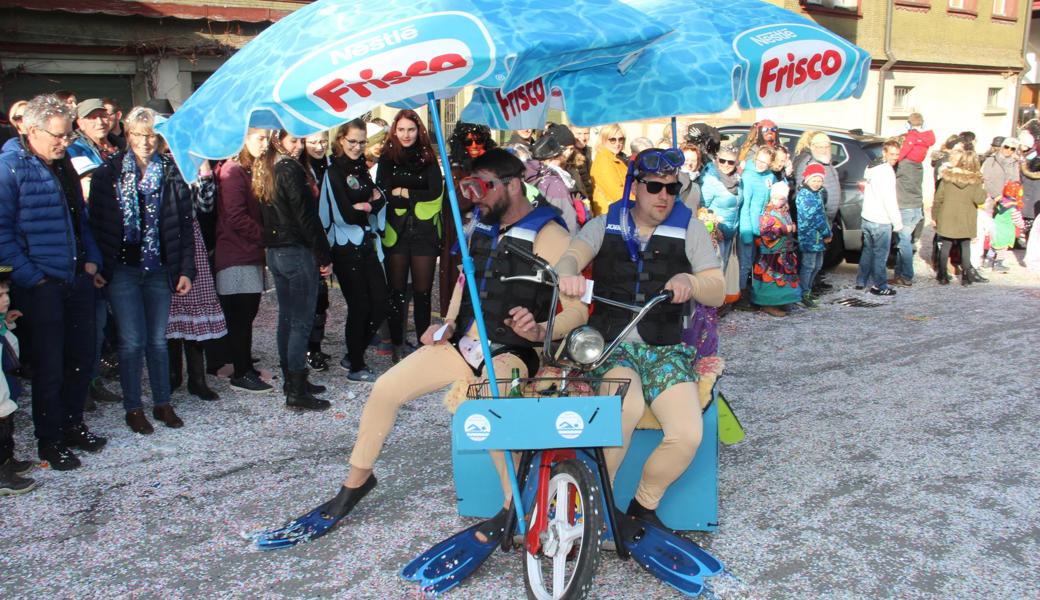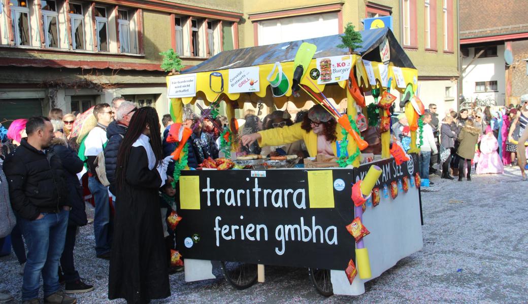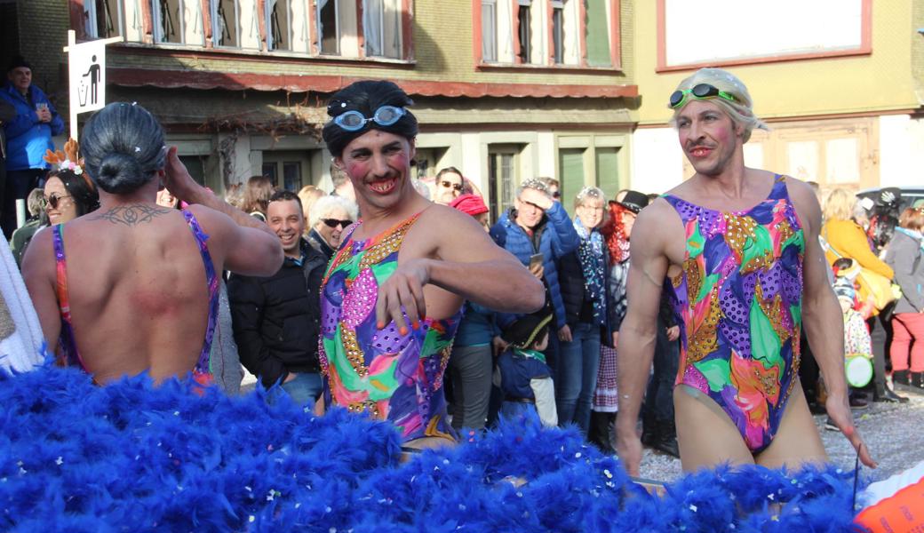 Einen Hallenbad-Verbund lässt sich der Badegast gern gefallen. Doch die Oberrheintaler und die Balgacher haben es nicht geschafft, ihre Hallenbäder aneinander vorbei zu erneuern. Tatsächlich brachten sie es fertig, dass beide Bäder vorübergehend geschlossen sind.Für die Ferien gmbh ein gefundenes Fressen. Sie stellen das Thema perfekt dar und ernteten viel Applaus am Rebsteiner Umzug.Die Umsetzung ist mehrteilig. Zunächst bekam das Publikum ein raffiniert gebautes Schwimmbecken zu sehen, aus dem drei Badegäste auftauchten und die eine gute Show boten. Es folgten ein Eiswagen, Badende, ein erstklassiger Kiosk mit Würsten vom Grill, sodann der grosse Wagen mit der Beschriftung "Hallenbad-Verschwund" - und zu guter Letzt folgte Adrian Heeb mit einer Tafel und der Frage: "Wo isch mis Hallebad?" Das Schwimmen ist das liebste Hobby des Rüthners, der als Mensch mit Beeinträchtigung im "Rhyboot" arbeitet und mit seiner offenen und freundlichen Art im ganzen Rheintal bekannt ist.Wäre für den Auftritt der Ferien gmbh eine Note zu vergeben, es wär eine Sechs plus!