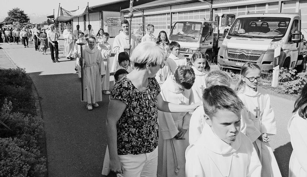 Bei strahlendem Sonnenschein und in Begleitung der Musikgesellschaft, der Ministrantinnen und Ministranten, des Kirchenchores und der Gottesdienstbesucher begaben sich die Erstkommunikanten nach der Feier der Eucharistie auf den Weg zur farbenfrohen Fronleichnams-Prozession. Die von Pfarrer Waldemar Piatkowski getragene Monstranz mit dem Allerheiligsten wurde im Festzug unter Besinnung und Musik durch die Strassen getragen und dabei von einem «Himmel» beschirmt. Bei zwei mit Blumen geschmückten Aussenaltären wurde gebetet und der sakramentale Segen in alle Himmelsrichtungen erteilt. Beim anschliessendem Apéro genoss man die Geselligkeit und liess den Sonntagmorgen ausklingen. (YP)