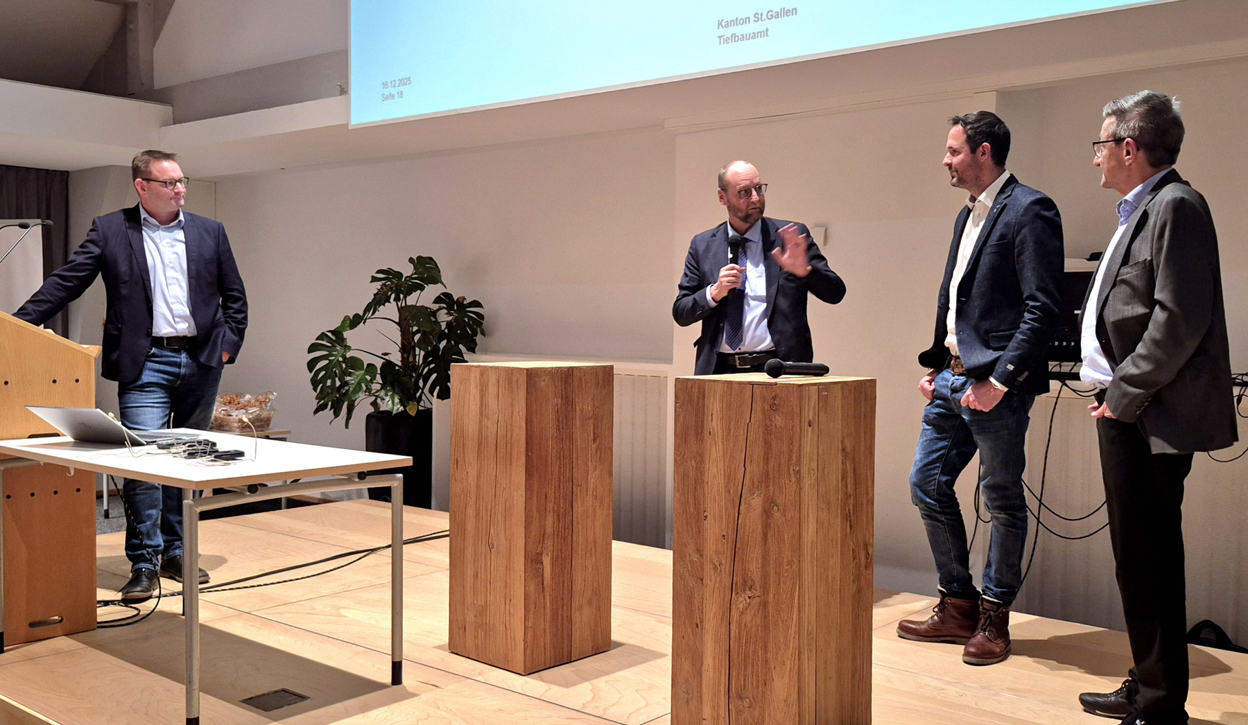 In der anschliessenden Podiumsdiskussion mit Jürg Röthlisberger, Pascal Hinder und Reto Friedauer wurde betont, dass punktuelle Massnahmen nicht genügten. Zentral seien grenzüberschreitende Lösungen wie ein Autobahnanschluss bei St. Margrethen sowie leistungsfähige Querverbindungen zur Entlastung der Hauptstrasse Au–Altstätten. Auch am Zoll in Au bestehe Handlungsbedarf: Die Brücke müsse rasch saniert werden, moderne digitale Lösungen könnten den Verkehrsfluss verbessern und damit spürbare Entlastungen für Bevölkerung und Wirtschaft bringen. «Gefordert sind ein ganzheitlicher Blick, klare Prioritäten und der politische Wille, zentrale Verkehrsprojekte konsequent umzusetzen», heisst es weiter.