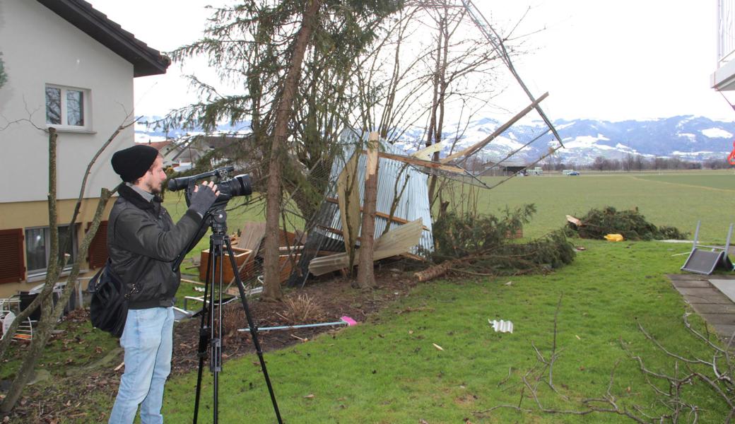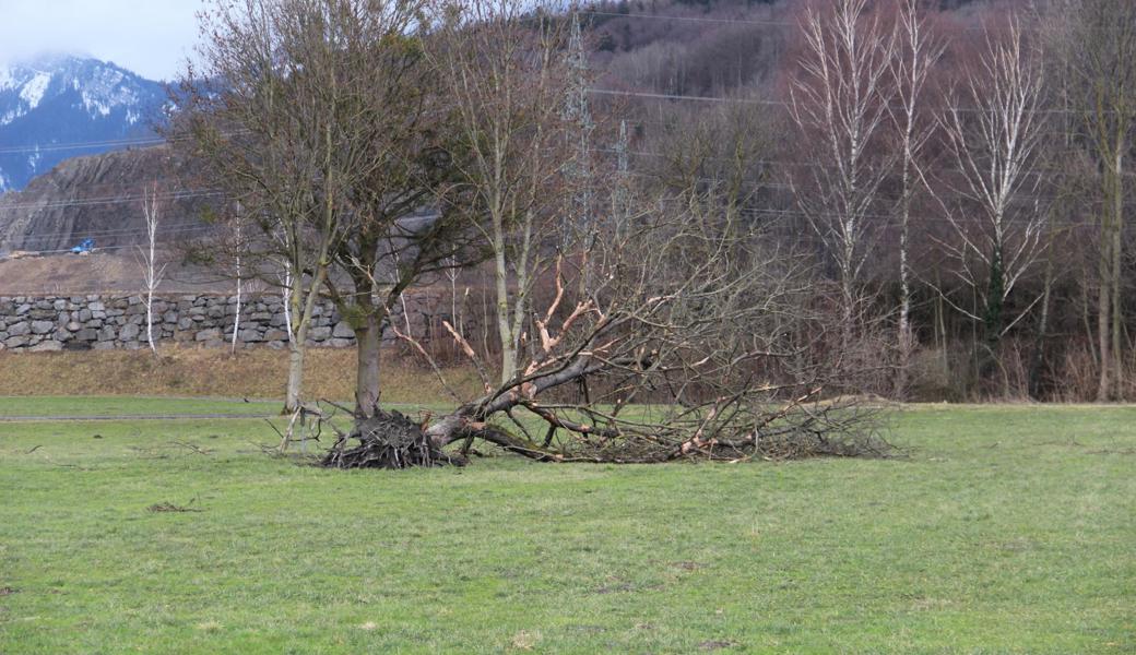 Dieses Bild, aufgenommen vom Montlinger Bergli, zeigt, wie der Sturm eine ganze gesunde Baumgruppe zerstört und das Dach eines Schafstalls (links) weggerissen hat; schon früh am Montag Morgen ist mit der Reparatur begonnen worden.