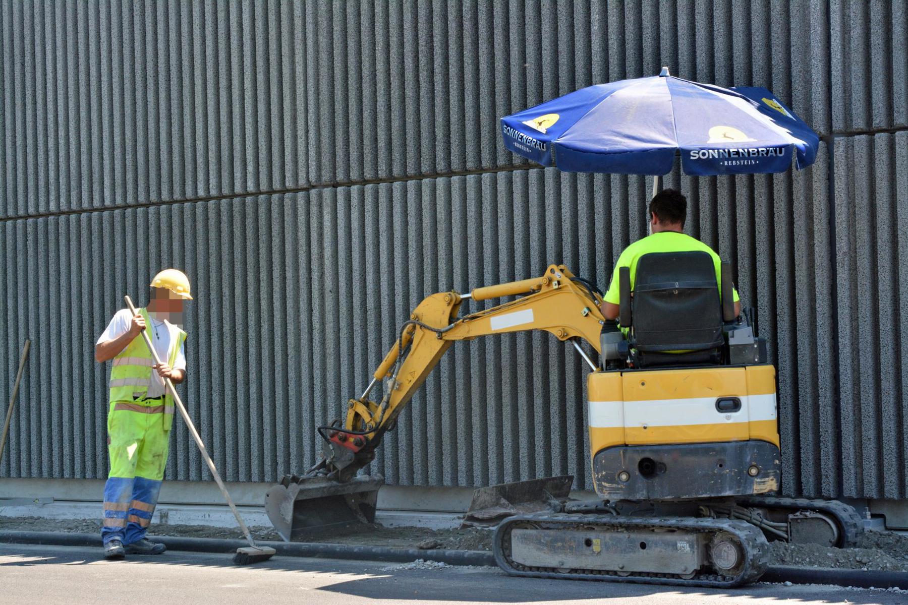 Zurzeit ist es wichtig, sich vor der Sonneneinstrahlung zu schützen. Das hat sich auch der Baggerführer auf der Autobahnbaustelle in St.Margrethen gedacht und sein Gefährt kurzerhand nachgerüstet.