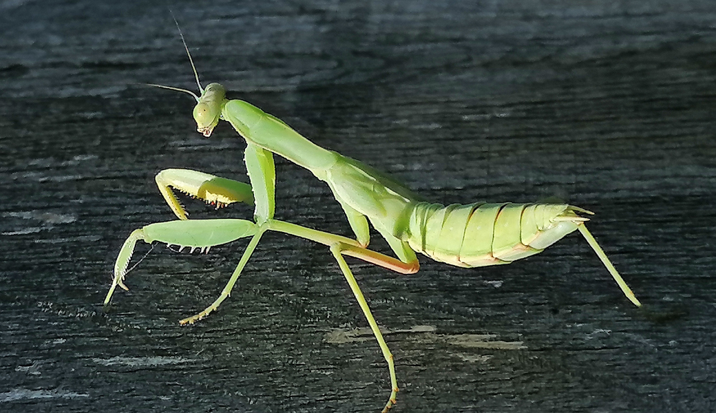 Es ist gerade Zeit, unsere Kübelpflanzen einzuwintern. Mein Kollege war gerade damit beschäftigt, seinen Oleander in den Wintergarten zu bringen, als ich auf seiner Schulter einen aussergewöhnlichen Gast bemerkte. Vorsichtig entfernte ich eine grasgrüne Südländerin von seiner Jacke, eine Gottesanbeterin. Die dachte sich wohl: «Was nicht ist, kann noch werden» – und ist irgendwie in die Nordschweiz gekommen.
