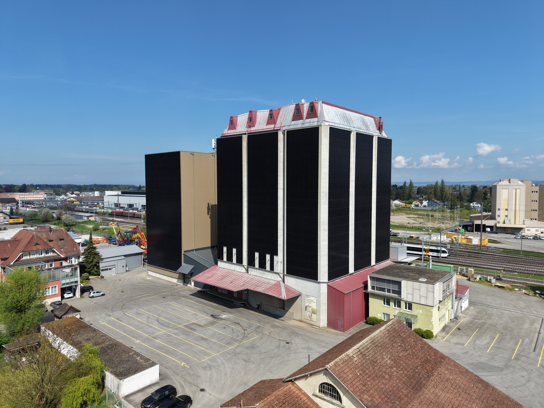 Die Silos der Lütolf AG in St. Margrethen sieht man schon von Weitem. Bis 50 Meter ragen sie gen Himmel hoch. Seit Neuestem sind sie, jeweils von der Ost-, Süd- und Westseite, mit einer Photovoltaik-Fassade ausgestattet. Mehr als eine halbe Million Franken hat die Lütolf AG in die Photovoltaikanlage investiert, wobei ein Anteil über staatliche Fördergelder finanziert wird.