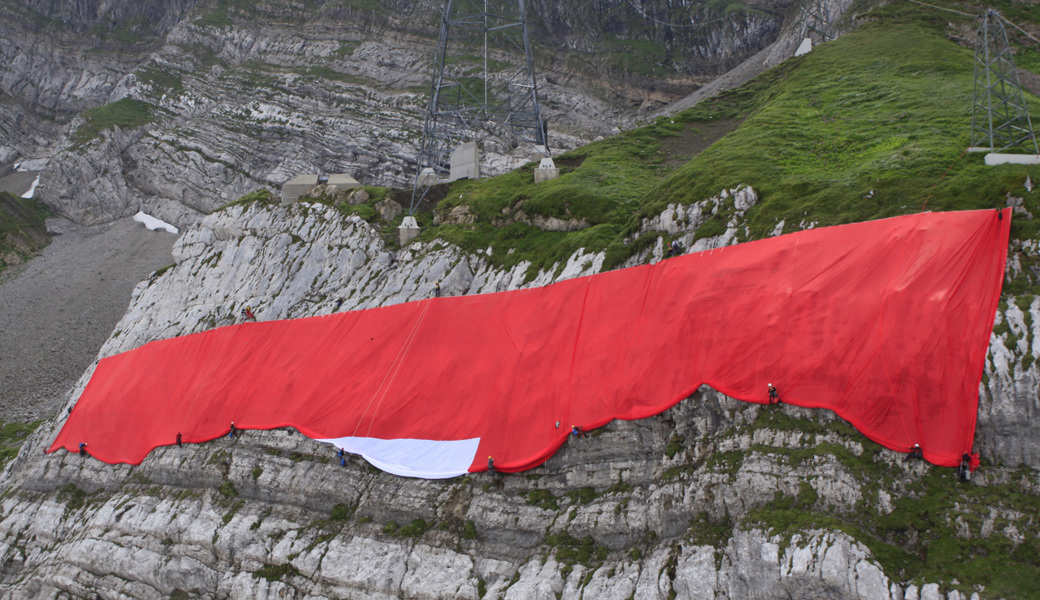 Die weltweit grösste Schweizerfahne wurde im Atelier der Heimgartner Fahnen AG in Wil konfektioniert und wird jeweils durch die Säntis-Schwebebahn AG, in Zusammenarbeit mit der Geo-Höhenarbeit AG, an die Säntiswand gehängt. Sie hat eine Fläche von 6400 m2.