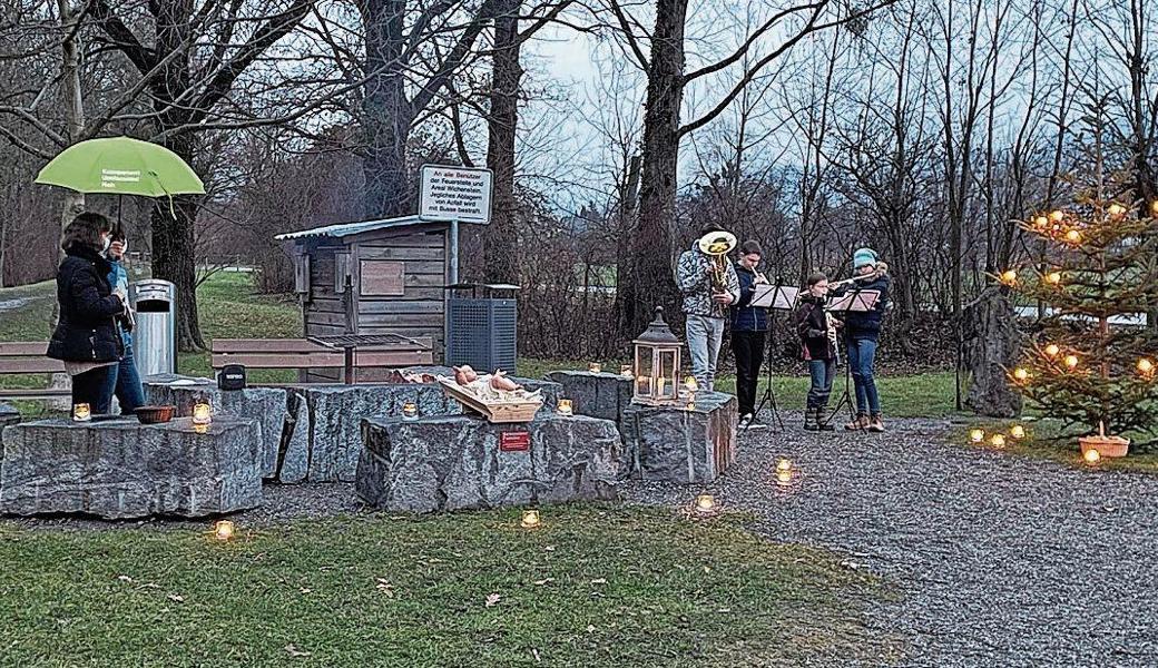 «Aus 1 mach 4»: Das war die Devise am Heiligen Abend in der Pfarrei Oberriet. Anstelle der einen Krippenfeier in der Pfarrkirche wurden zeitgleich vier Outdoorfeiern in verschiedenen Quartieren angeboten. Das Angebot kam an: Alle Krippenfeiern waren gut besucht. Dies auch, weil an jedem Ort für passende musikalische Umrahmung durch ein Bläserensemble sowie durch entsprechendes Ambiente gesorgt werden konnte. Nicht zuletzt auch deswegen, weil sich Pfarreirätinnen und die Mitgliedsfrauen der Liturgiegruppe sehr engagiert haben. Die Andachten haben Maria Zäch, Katja Langenegger, Gabi Ceric und Gabriela Weber geleitet. Das Weihnachtsevangelium wurde vorgetragen. Auch Fürbittgebet und Vaterunser waren wesentliche Elemente. Die Kollekte wurde zugunsten des Kinderspitals Bethlehem aufgenommen. Und wer mochte, konnte auch das Friedenslicht von Bethlehem für die Feier zu Hause mitnehmen. (pd)