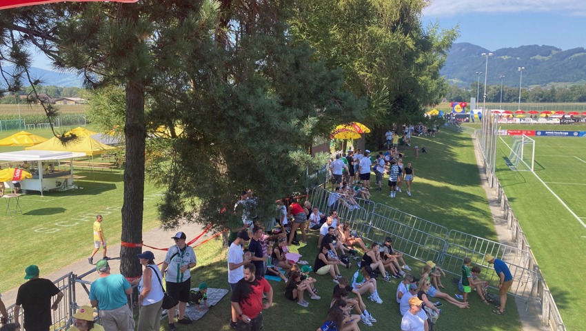 12.31 Uhr – Auch an die Medien hat der FC Widnau gedacht: Hinter einer Ecke hat er ein Stahlrohrgerüst aufgebaut, auf dem die Medienvertreter willkommen sind. Mein Sitznachbar dort oben freut sich schon mal darüber, was der FCW auf die Beine gestellt hat und ist voll des Lobes. Ich bin es übrigens auch: Hier in der Höhe weht sogar ein Lüftchen, das die Hitze erträglicher macht. So lässt sich arbeiten!