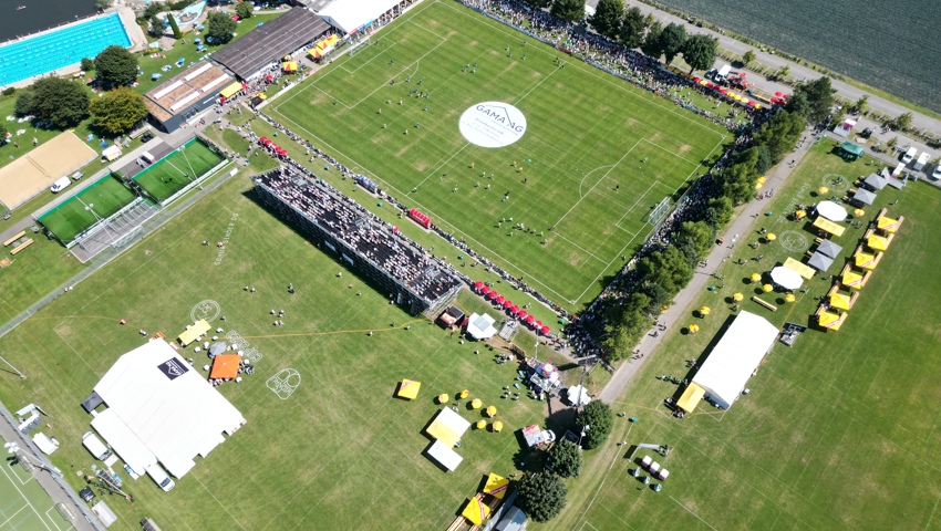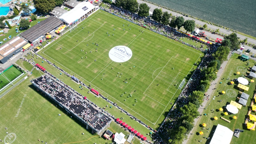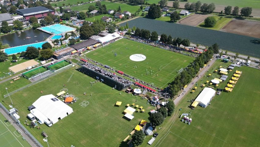 Pause – Zeit, um einen Blick von oben auf das Gelände zu werfen! Die Bilder hat vor dem Spiel meine Kollegin Cassandra Wüst gemacht. Ein Dank an dieser Stelle übrigens auch an meinen Kollegen Yann Lengacher, der mich immer wieder mit Infos versorgt. Seine Berichte vom heutigen Spiel sind dann morgen in der Zeitung zu lesen!