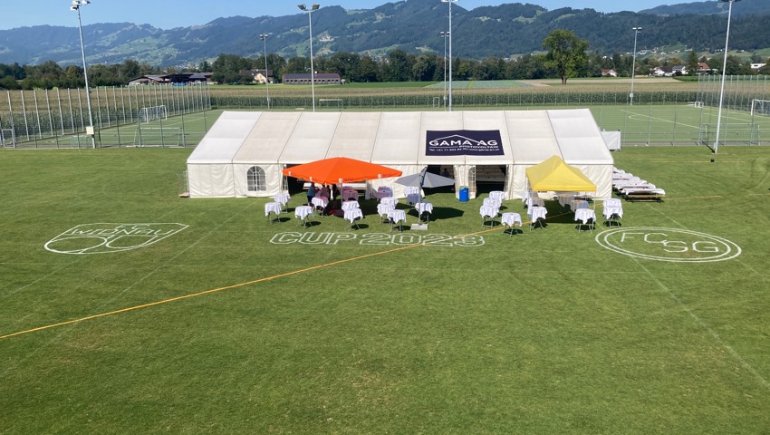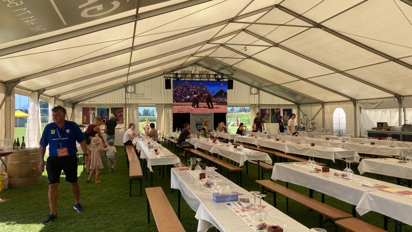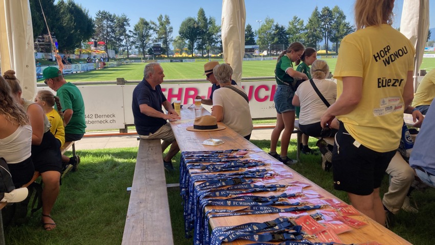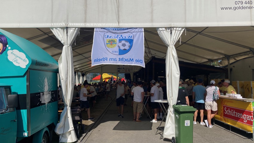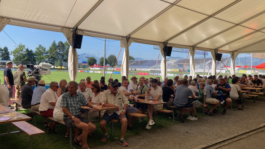 10.00 Uhr - Der FC Widnau öffnet die Pforten und viele Besucherinnen und Besucher nehmen schon einmal im Festzelt Platz. Sie interessieren sich auch für eine andere Sportart, nämlich Schwingen: Auf der Schwägalp findet gerade das grosse tradiitonelle Schwingfest statt, das in Widnau im Festzelt gezeigt wird.