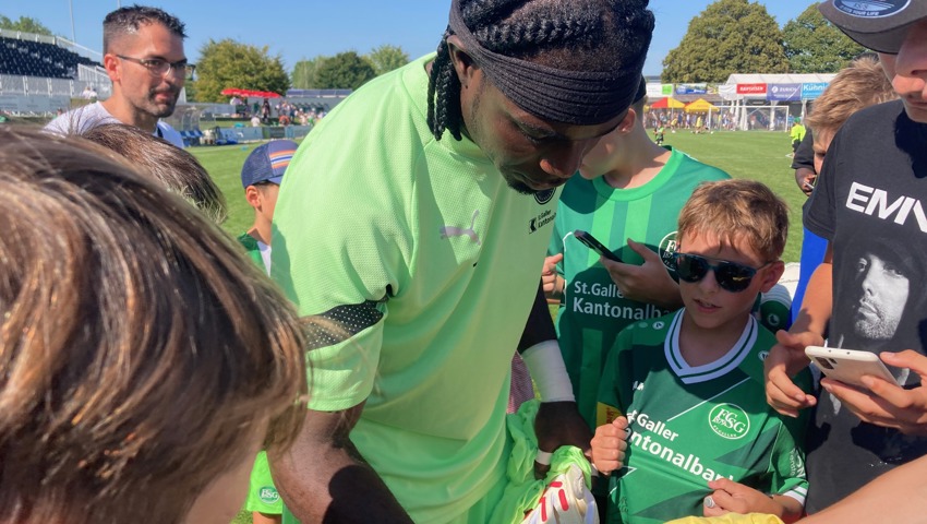 12.43 Uhr – Die St. Galler Spieler betreten den Platz. Goalie Lawrence Ati Zigi nimmt sich Zeit für die Fans, unterschreibt links und rechts Trikots.