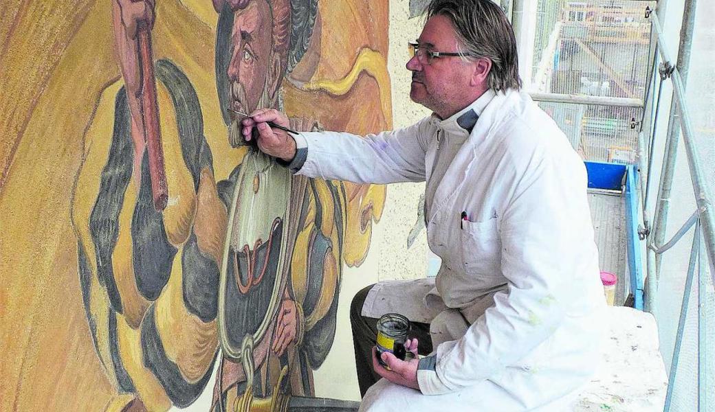 Nach mehr als 50 Jahren war es für den Fahnenträger an der Zeit, eine Schönheitskur zu erhalten. Abgeplatzte Farben sowie Fehlstellen liessen das Werk glanzlos aussehen, Wettereinflüsse wuschen die Farbbindemittel aus. Im Mai bot sich die Gelegenheit einer Auffrischung, als das kantonale Hochbauamt – das Gebäude befindet sich in Besitz des Kantons St. Gallen – Malerarbeiten an der Fassade in Auftrag gab. Das Malergeschäft Langenegger und Gächter übertrug die Arbeit am Gemälde dem einheimischen Restaurator Mauro Ferrari, mit dem eine langjährige Zusammenarbeit besteht.Der Mann im weissen Kittel reinigte das Gemälde zunächst von Schmutz und liess Risse und nussgrosse Löcher verschwinden. Um das Bild zu festigen, wendete er die Kaliwasserglastechnik an, ähnlich der Freskomalerei: «Diese Technik erlaubt es, das Maximum aus einem solchen Wandgemälde zu holen.» Die Farben verbinden sich mit dem Verputz und lassen das Bild wieder frisch und satt wirken.Kunst am Bau war in den 1930er-Jahren sehr beliebtDer Fahnenträger ist in den Farben des Altstätter Wappens gehalten – Schwarz, Rot und Gold (Gelb). Mauro Ferrari vermutete erst, es könnte sich anhand der Uniform auch um einen Gardisten handeln. Abwegig sei dieser Gedanke nicht, bestätigt Anwalt und Präsident des Museumsvereins Prestegg, Werner Ritter. Es sei ein Söldnerführer, inspiriert vom Stil der Renaissance. Das historische Motiv zeuge von Geschichtsbewusstsein und der damals populären Kunst am Bau.Das Bild, gemalt vom Altstätter Wilhelm Thür, entstand 1937 bis 1938 nach der Fertigstellung des Amtshauses, das von Beginn an als Sitz des Polizeipostens diente. Das Bild passe hervorragend in die Zeit der geistigen Landesverteidigung vor dem zweiten Weltkrieg, sagt Werner Ritter. Es mache die Rückbesinnung auf die Stärke der alten Eidgenossen deutlich.Erstmals restauriert wurde das Bild im Jahr 1969 von Josef Benz. Vor wenigen Tagen konnte nun Mauro Ferrari seine Arbeit vollenden. Er investierte rund 50 Arbeitsstunden in das Werk. Die schattige Lage an der Nordseite des Gebäudes und ein schützendes Vordach waren von Vorteil, da bei der angewandten Farbtechnik möglichst keine Sonnenbestrahlung vorhanden sein sollte. Am liebsten sei ihm bewölktes Wetter, sagt Mauro Ferrari. Sonst spannt er Tücher, um Sonne und Regen abzuwenden.Den Arbeitsplatz auf dem Gerüst schätzt der Restaurator. Die Höhe mache ihm keine Probleme. «Ich bin schwindelfrei.» Im Städtli sei es auch interessanter als in seinem Atelier in Lüchingen, da er die Umgebung wahrnehmen könne und ein Austausch mit Anwohnern stattfinde. «Es sieht wieder schön aus», riefen sie ihm zu. Und: Er solle seine Unterschrift unter das Bild setzen. Sein Name ist tatsächlich zu erkennen, wie auch jener seines Restaurator- Vorgängers Benz.Mauro Ferrari dokumentierte seine Arbeit mit zahlreichen Fotos, von denen er einen Teil an die Denkmalpflege weiterreicht. Eine nächste Renovation des Fahnenträgers ist wieder in etwa 30 bis 40 Jahren angebracht.