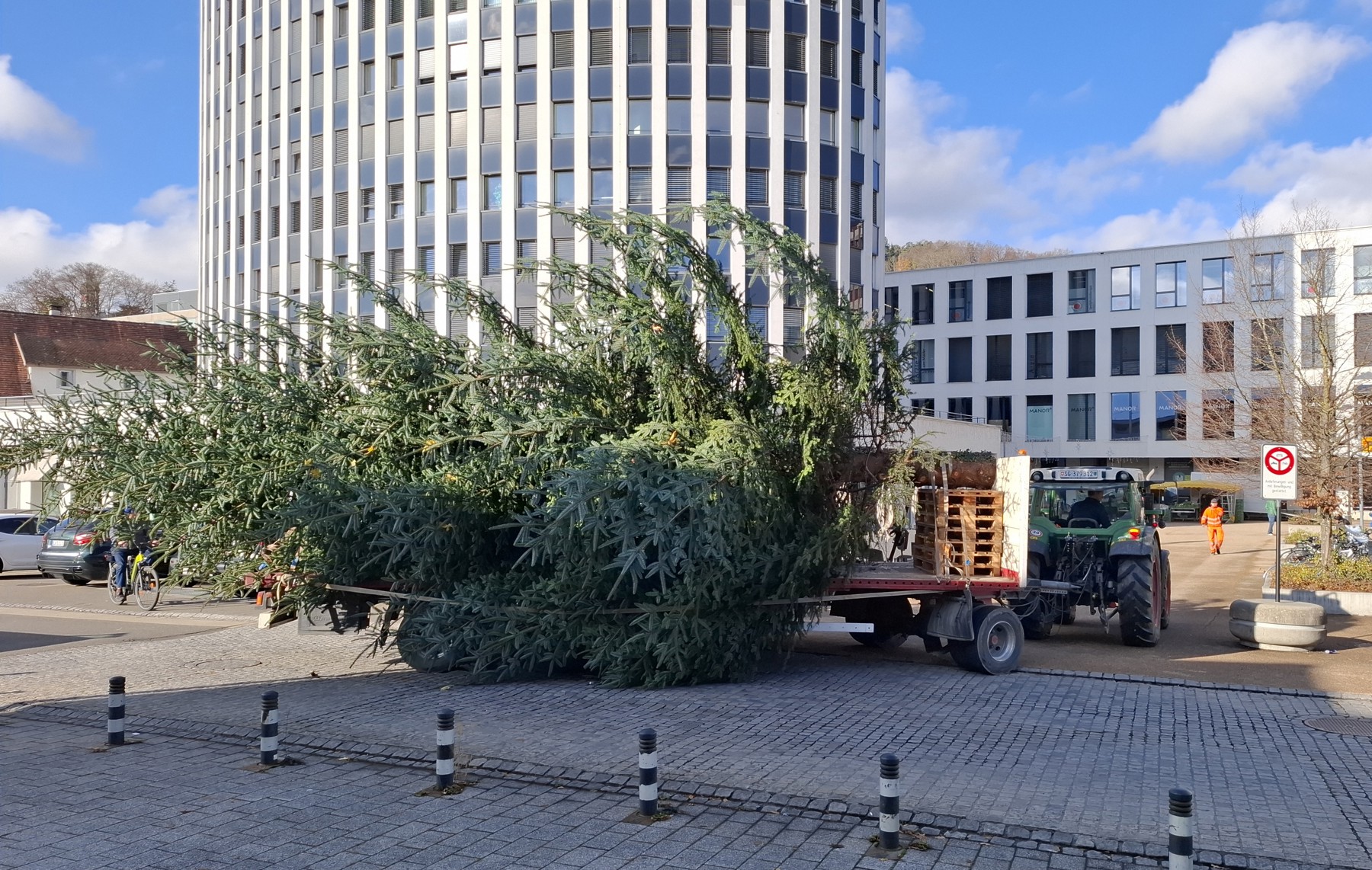 Mit Traktor und Kran: Wie zwei imposante Christbäume den Weg zu ihrem Platz fanden