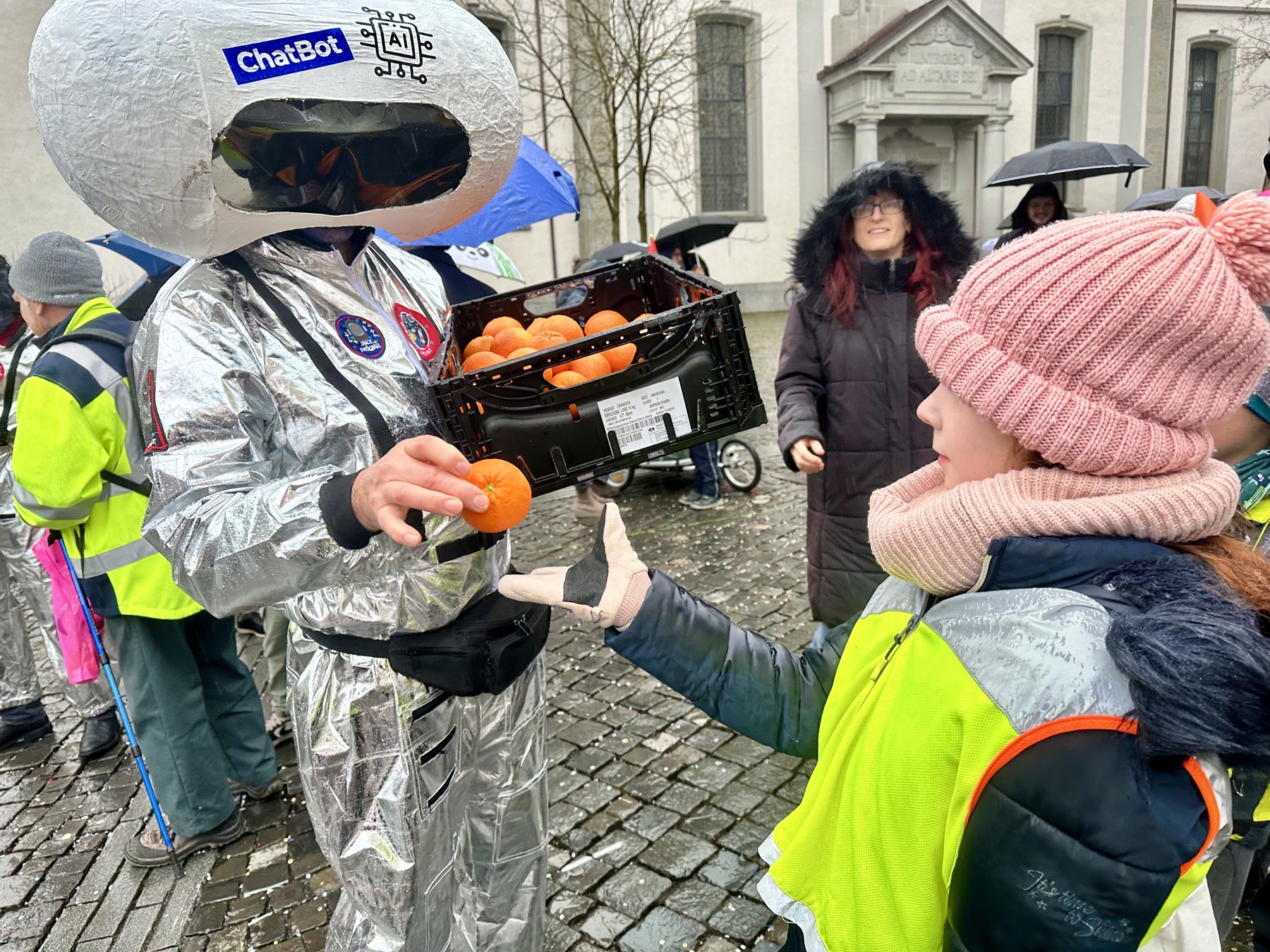 AnmeldenDie Fasnachtsmontag-Clique machte Künstliche Intelligenz zu ihrem Motto. Ansonsten gab es auf dem Altstätter Rathausplatz wie immer Orangen für die Kinder und Humor für die Erwachsenen.