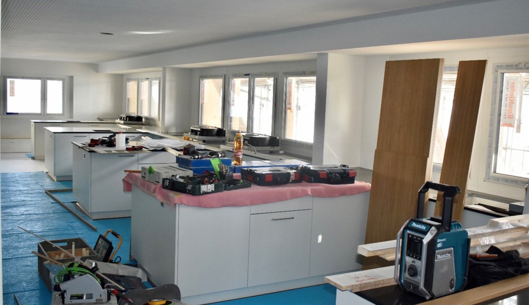 Rundum gut eingepackt unter dem Baugerüst sind die Arbeiten nur teilweise von aussen wahrnehmbar. Die Aussendämmung ist angebracht und schon folgt die Fassadenverkleidung aus hochwertigen und langlebigen Schieferplatten. Diese ersetzen auf der gesamten Anlage die bisherigen Eternitkacheln. Auch im Gebäudeinnern sind die Baufortschritte deutlich erkennbar. Bestehendes Mobiliar wird repariert und aufgefrischt, neue Bodenbeläge verlegt, Wände gemalt und die Decke mit schalldämmenden Gipslochplatten verkleidet. Im 1. Obergeschoss oberhalb der Bibliothek wurde die Schulküche aus den 90er Jahren komplett ersetzt.