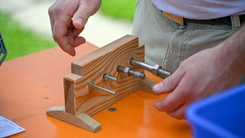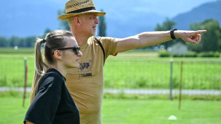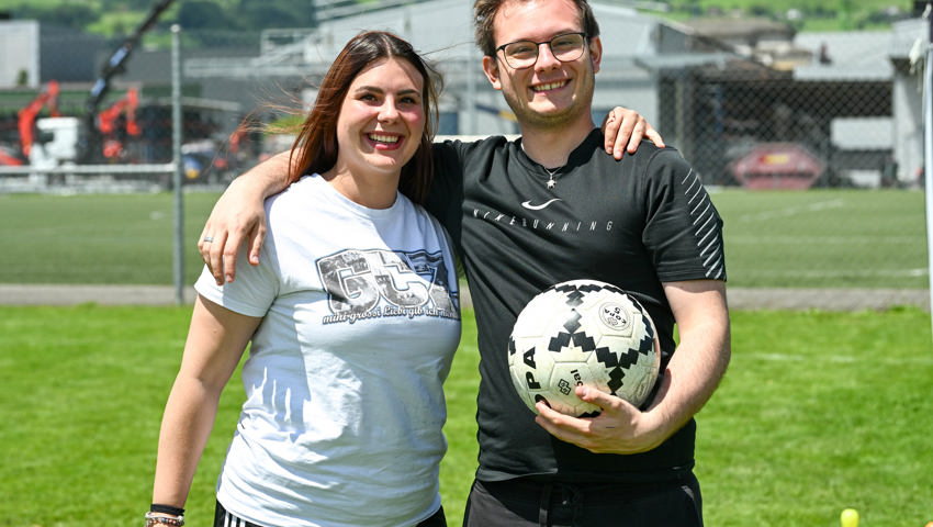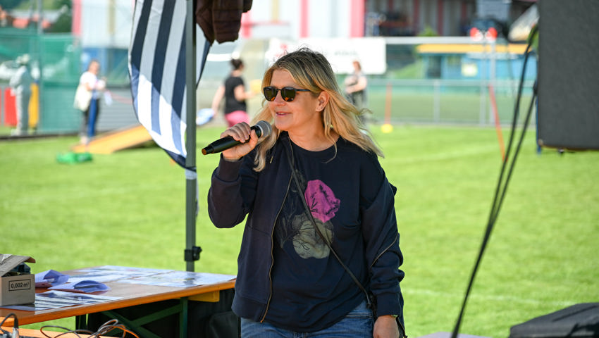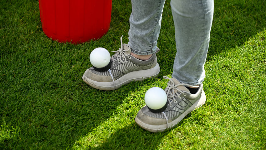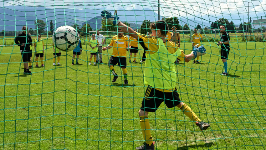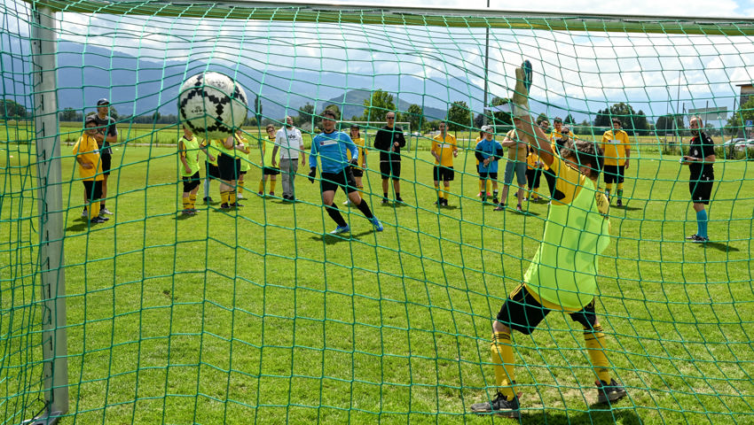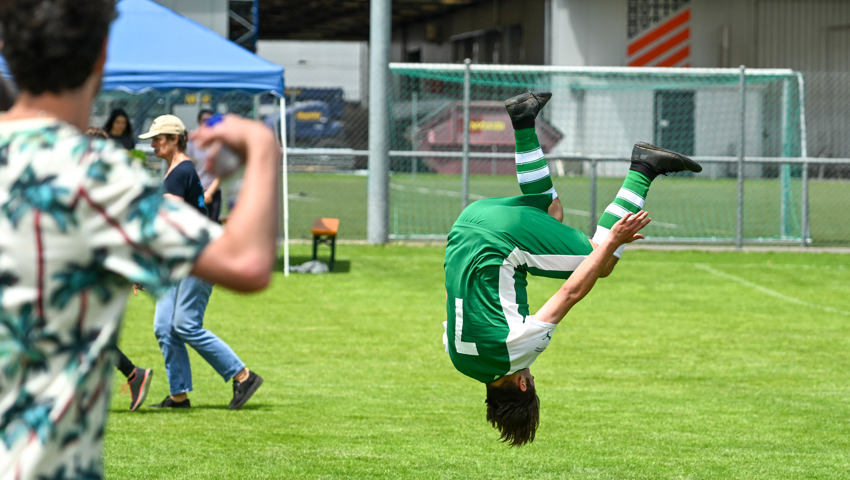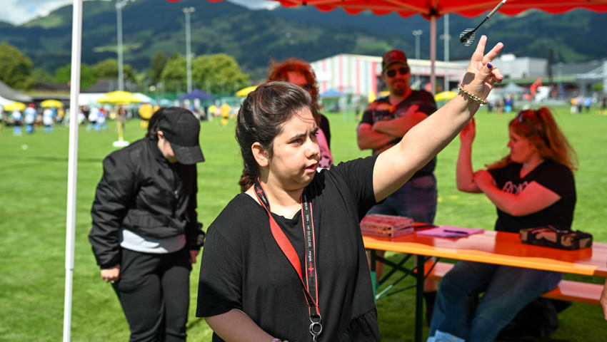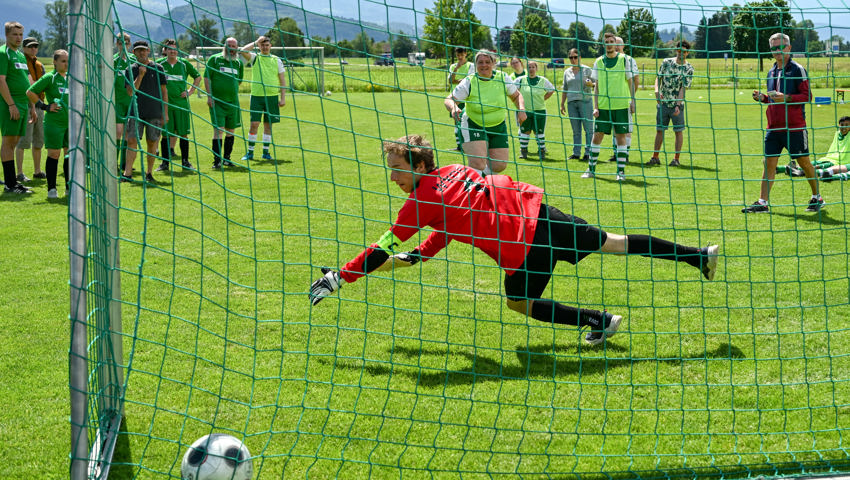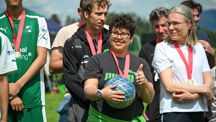 Für das Dartspiel gab es eine separate Einzelwertung. Es gab hervorragende Versuche, am meisten Punkte glückten Erika Ladner von der Bleichi, die unter Applaus die Medaille empfing und dann gleich noch als Glücksfee amten durfte. Geschicklichkeit erforderte ein Spiel, in dem die Startenden zwei Styroporkugeln auf den Füssen ein paar Meter weit transportieren und dann in einen Kübel ablegen mussten. Dafür wurde den Sportlerinnen und Sportlern eine Form an die Schuhe geschnallt, damit die Kugeln nicht herunterrollen. Alle Kugeln wollten sich aber nicht in der Form halten. Einige rollten davon, noch ehe das Ziel erreicht war.