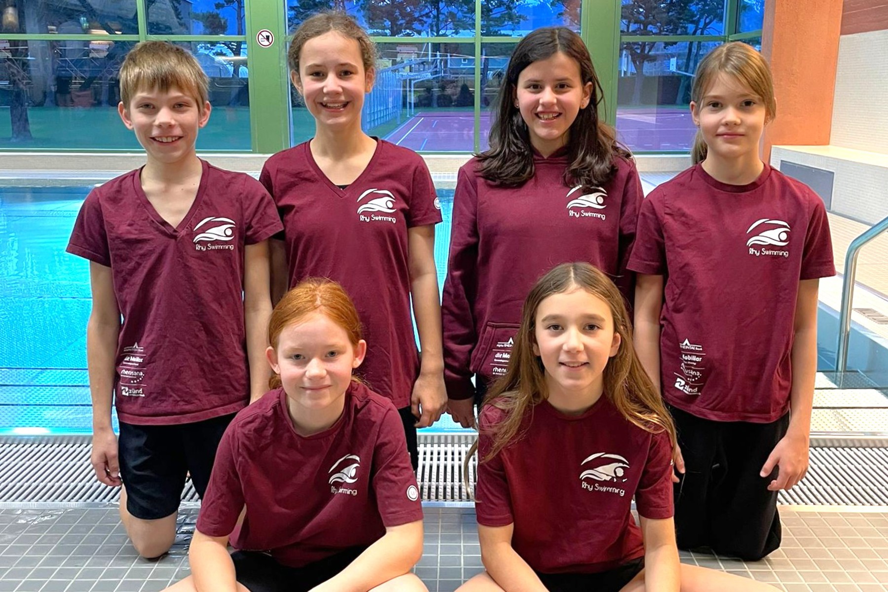 Der traditionelle Flöserfisch ermöglichte auch älteren Schwimmerinnen und Schwimmern des Teams einen Start über 50m Freistil und 100m Lagen, einen Team-Wettkampf mit Mixed-Staffeln sowie als spezielle Herausforderung einen KO-Event über 50m Freistil. Im klassischen Wettkampfteil holte das 13-köpfige Rhy-Swimming-Team zwölf Flöserfische. Die Mixed-Staffel glänzte mit Rang zwei bei den bis 15-Jährigen. Erste Wettkampferfahrungen, verbesserte Bestzeiten oder die Challenge im KO-Rennen: Alle gaben ihr Bestes und freuten sich über die Fortschritte. Die einmaligen Flöserfisch-Medaillen – Porzellanfische – in den Sprintrennen sicherten sich Eliah Schällebaum, Malvin Schacht (beide zweimal Gold), Stella Fixmer (zweimal Silber), Dario Hautle (Bronze), Tammo Schacht und Tjalda Schacht (beide zweimal Bronze).