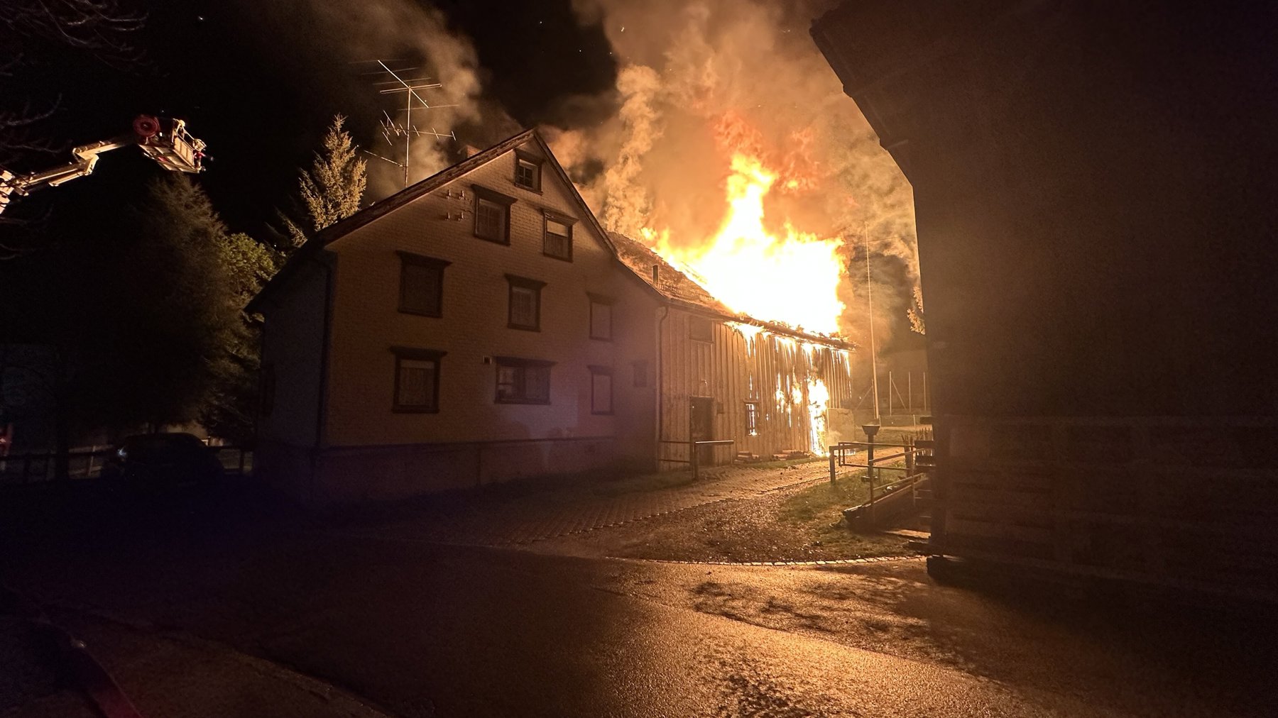 Ein Übergreifen des Feuers auf das Wohnhaus liess sich nicht verhindern. Deshalb entstand an diesem ebenfalls ein erheblicher Sachschaden.