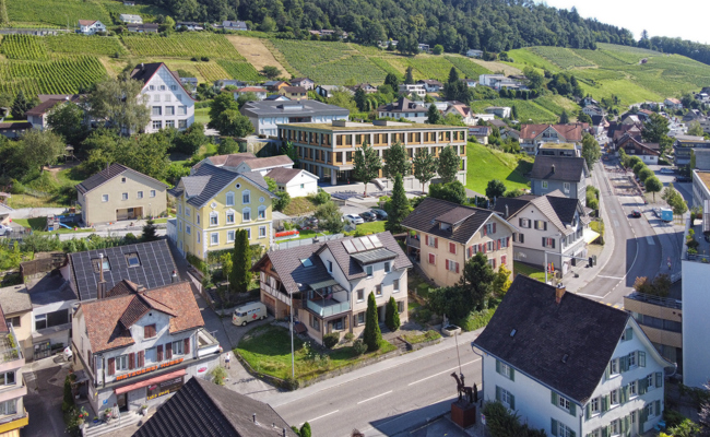 Die Liegenschaft grenzt unmittelbar an das Grundstück Breite der Primarschulgemeinde, wo sich das bestehende Schulhaus, der Kindergarten und die Freifläche für den geplanten Neubau befinden.