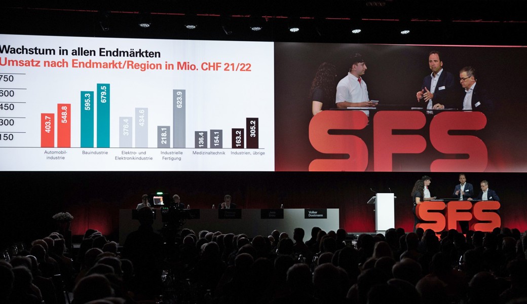 Nach einem Rückblick auf das Geschäftsjahr 2022 und einer Talkrunde zweier SFS Lernenden mit Jens Breu (CEO) und Volker Dostmann (CFO) folgte das statutarische Programm. Wie schon in früheren Jahren leisteten über 100 Lernende einen wichtigen Beitrag zum Gelingen der Generalversammlung. Damit unterstreicht SFS die Bedeutung der Berufslehre für den Erfolg des Unternehmens.