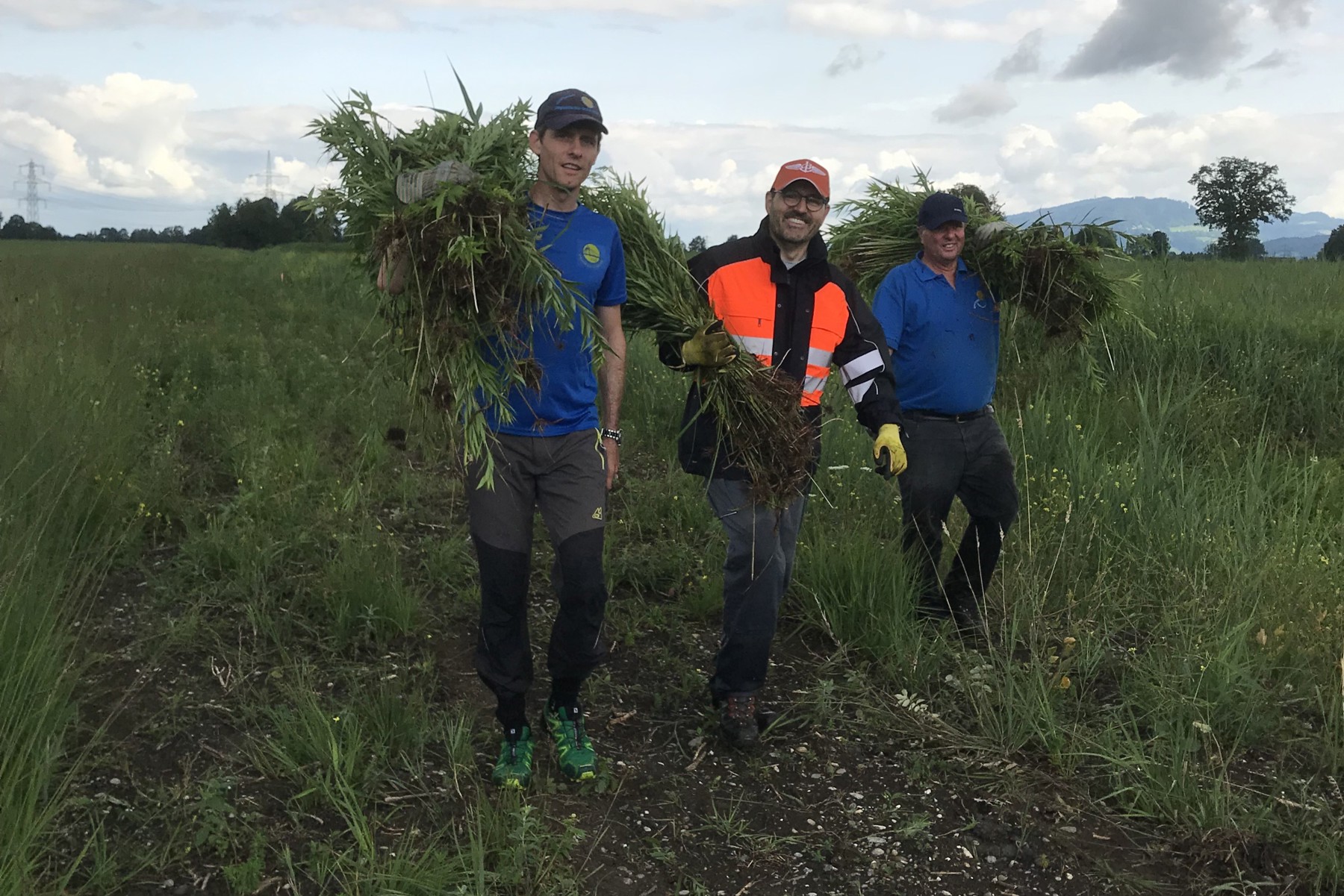 Besonders häufig treten auf: Einjähriges Berufkraut, Schmalblättriges Greiskraut und Spätblühende Goldrute. Passantinnen und Passanten, die solche Pflanzen entdecken, können diese möglichst samt den Wurzeln ausreissen und in die dafür bereitgestellten Behälter entsorgen. Die beschrifteten Behälter stehen während der Sommermonate auf dem Hochwasserdamm am oberen Rheinspitz, im Bereich der Panoramatafel und am unteren Rheinspitz. Die Leerung der Behälter erfolgt durch die Gemeinde. Invasive Neophyten aus Gärten oder privatem Umfeld können weiterhin kostenlos im offiziellen Neophytensack über den Kehricht entsorgt werden. Die Säcke sind gratis am Schalter der Gemeinde oder im Werkhof erhältlich.